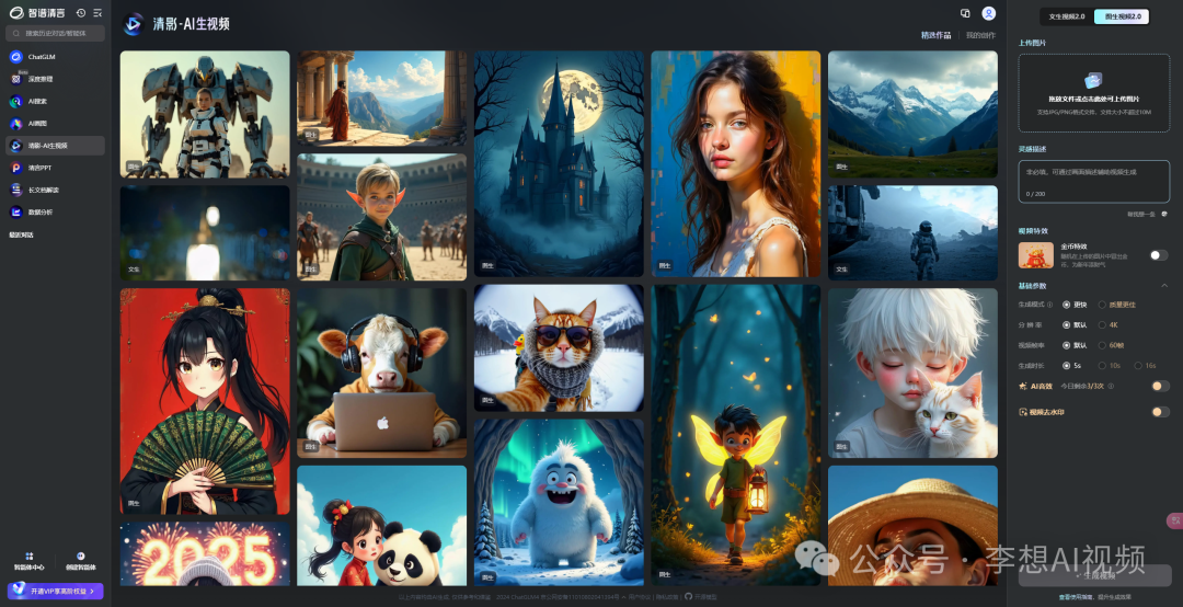 最后介绍个免米的,是智谱清言的智谱清影,没想到吧,我们智谱清言还有这个能力!最大的好处就是免费,反正能白嫖,大家可以通过练习练习生成视频的技巧