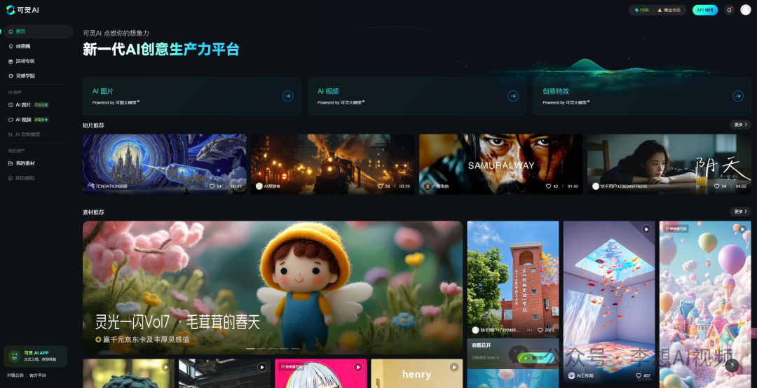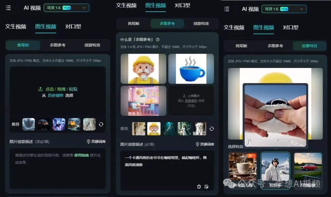 拥有首尾帧、多图参考,并且还有创意特效等功能,还可以对口型,让人物唱歌、高效的功能就是这么来的!