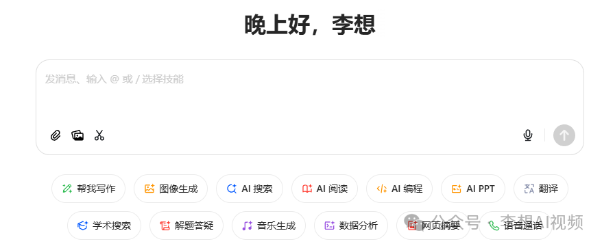 写作、图像生成、AI搜索、AI阅读、AI编程、一键制作PPT、翻译、学术搜索、解题答疑、音乐生成、数据分析、网页摘要、语音通话。