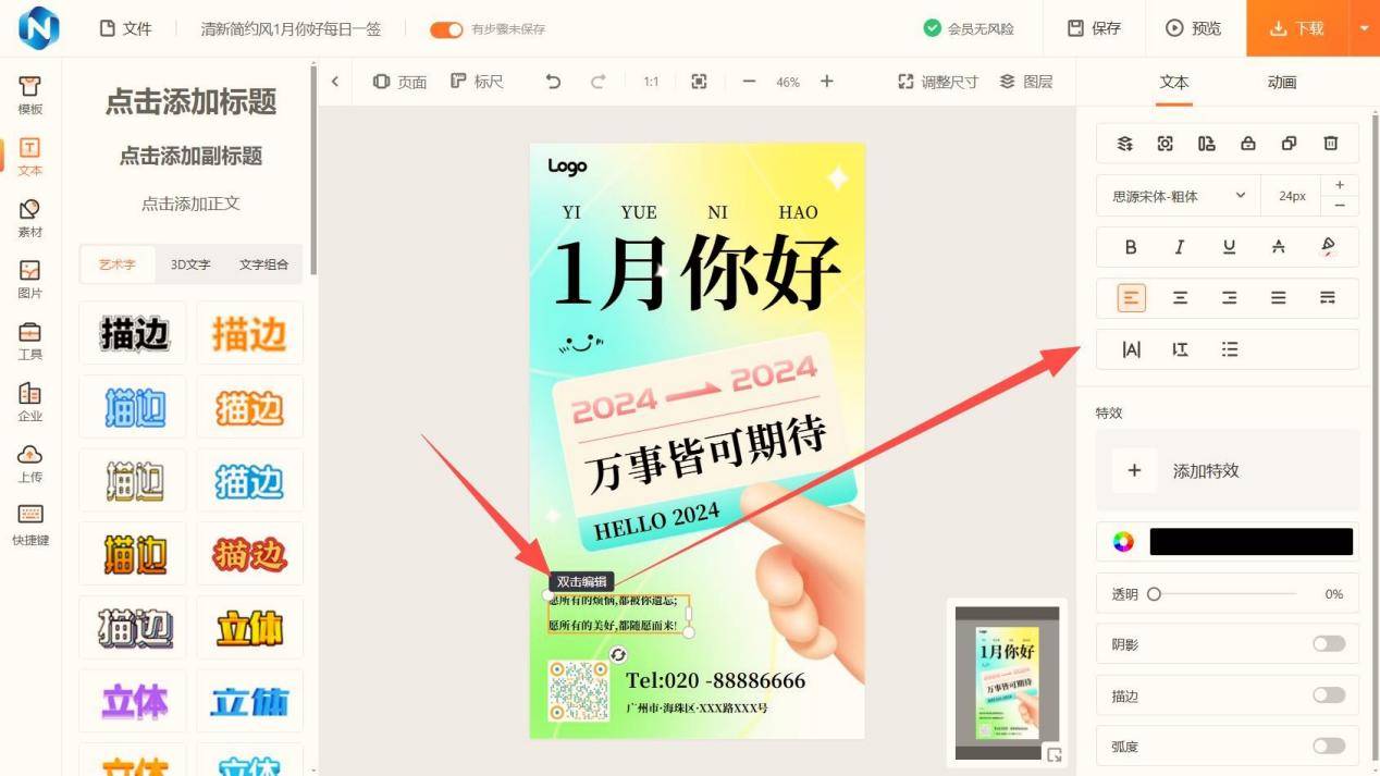 1. 双击模板中的文字区域,删除原有内容,输入自己的文案(标题、副标题、说明文字)。