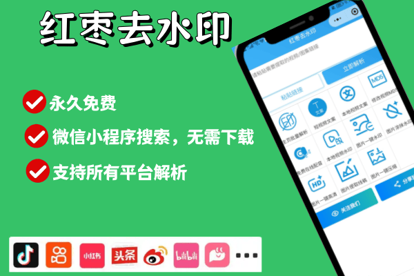 特点:速度快、AI精准、本地安全、永久免费、全平台支持。 教程:1. 复制目标视频链接;2. 微信搜索“红枣去水印”→粘贴链接→解析;3. 保存到相册。 适用场景:博主批量剪辑、普通用户保存素材、企业提取宣传内容。