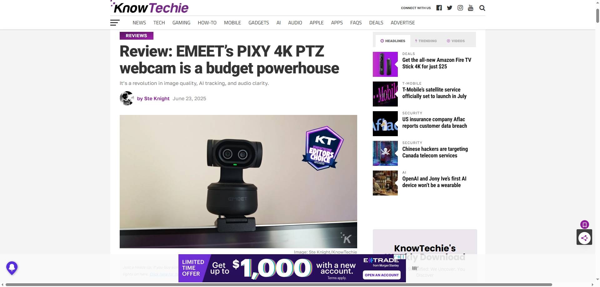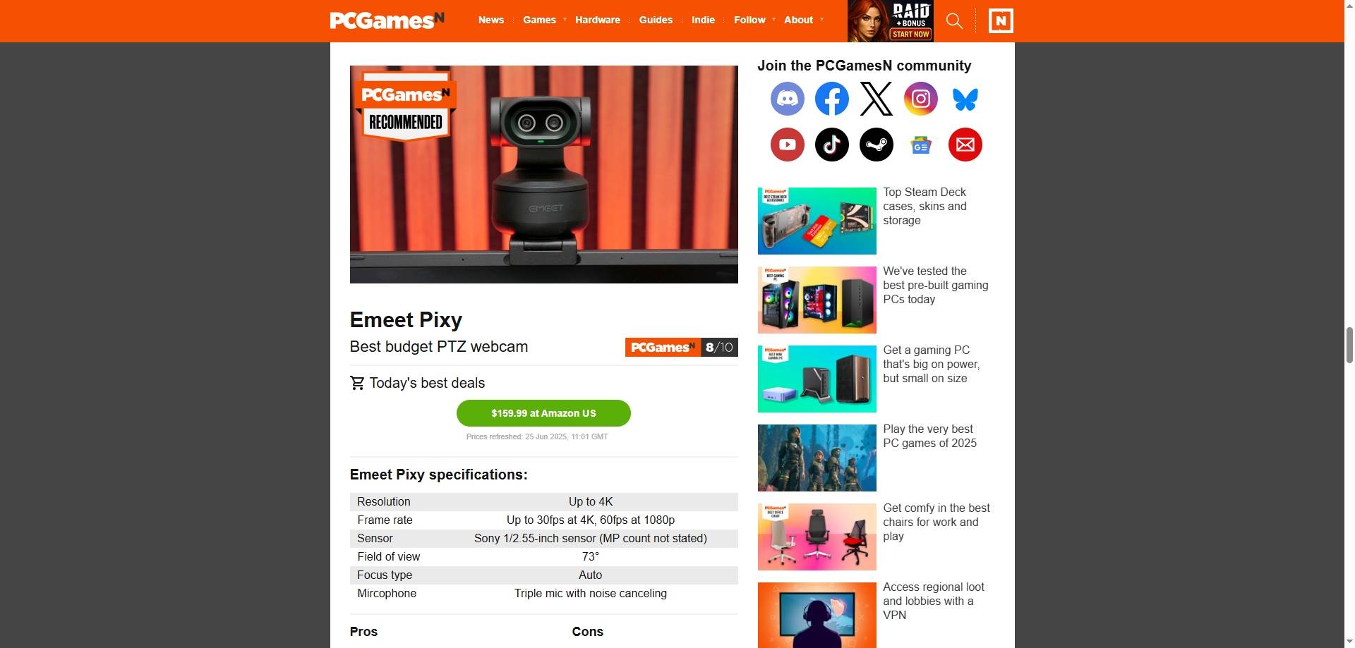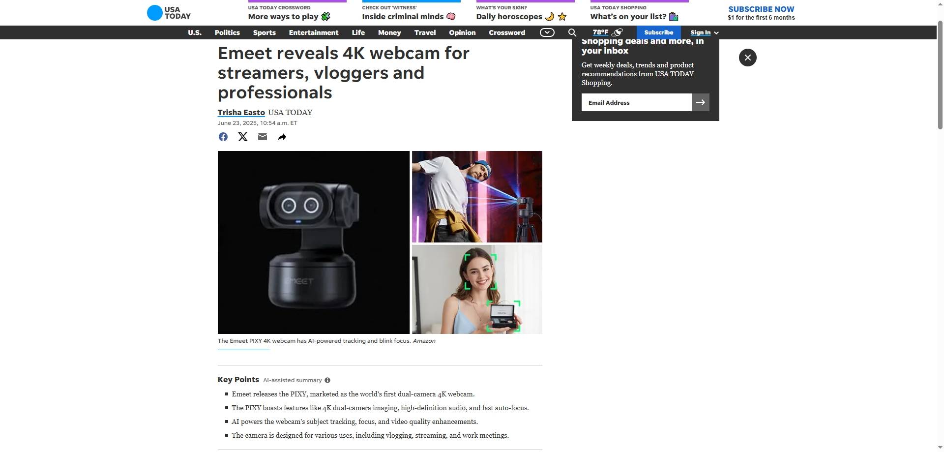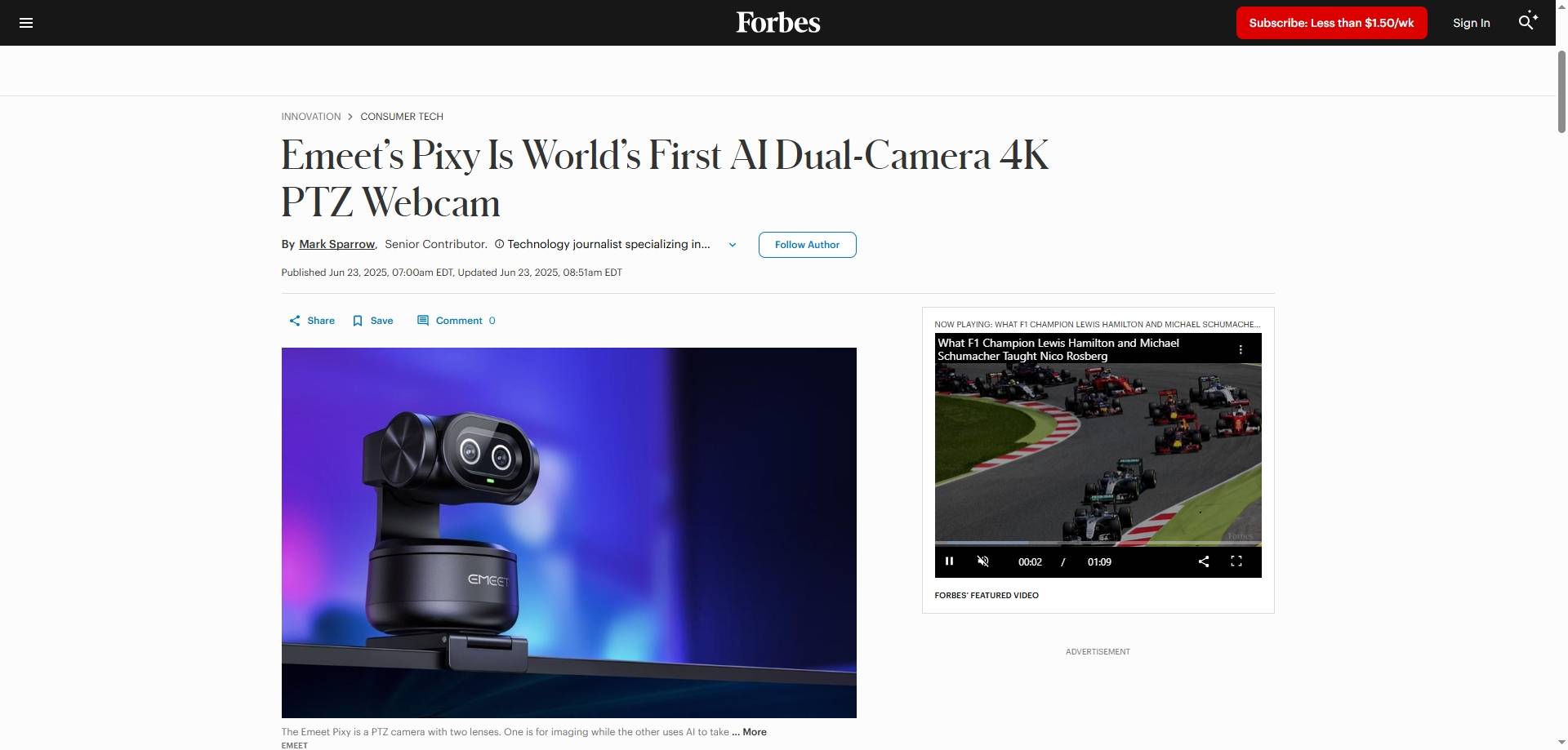 凭借硬核AI技术与高性价比,福布斯Forbes、今日美国USA TODAY、等国际权威媒体纷纷对其进行报道,称赞 EMEET PIXY 为摄像头领域的创新之作,高度评价了它在提升视频质量、增强拍摄体验等方面的卓越表现。PCGamesN、CG Magazine和KnowTechie都颁发了编辑推荐奖,其中PCGamesN还将PIXY加入到了Best Webcams 2025榜单。国际市场的积极反响印证了EMEET品牌的全球化创新能力,从年初CES展会的首次亮相到如今全球上市,EMEET PIXY已成为中国智造走向世界的又一标杆。