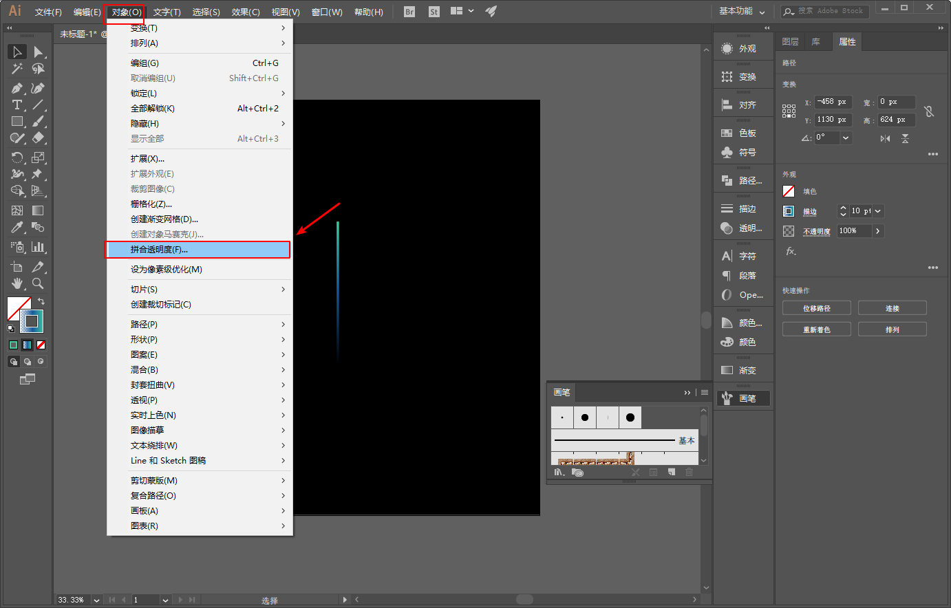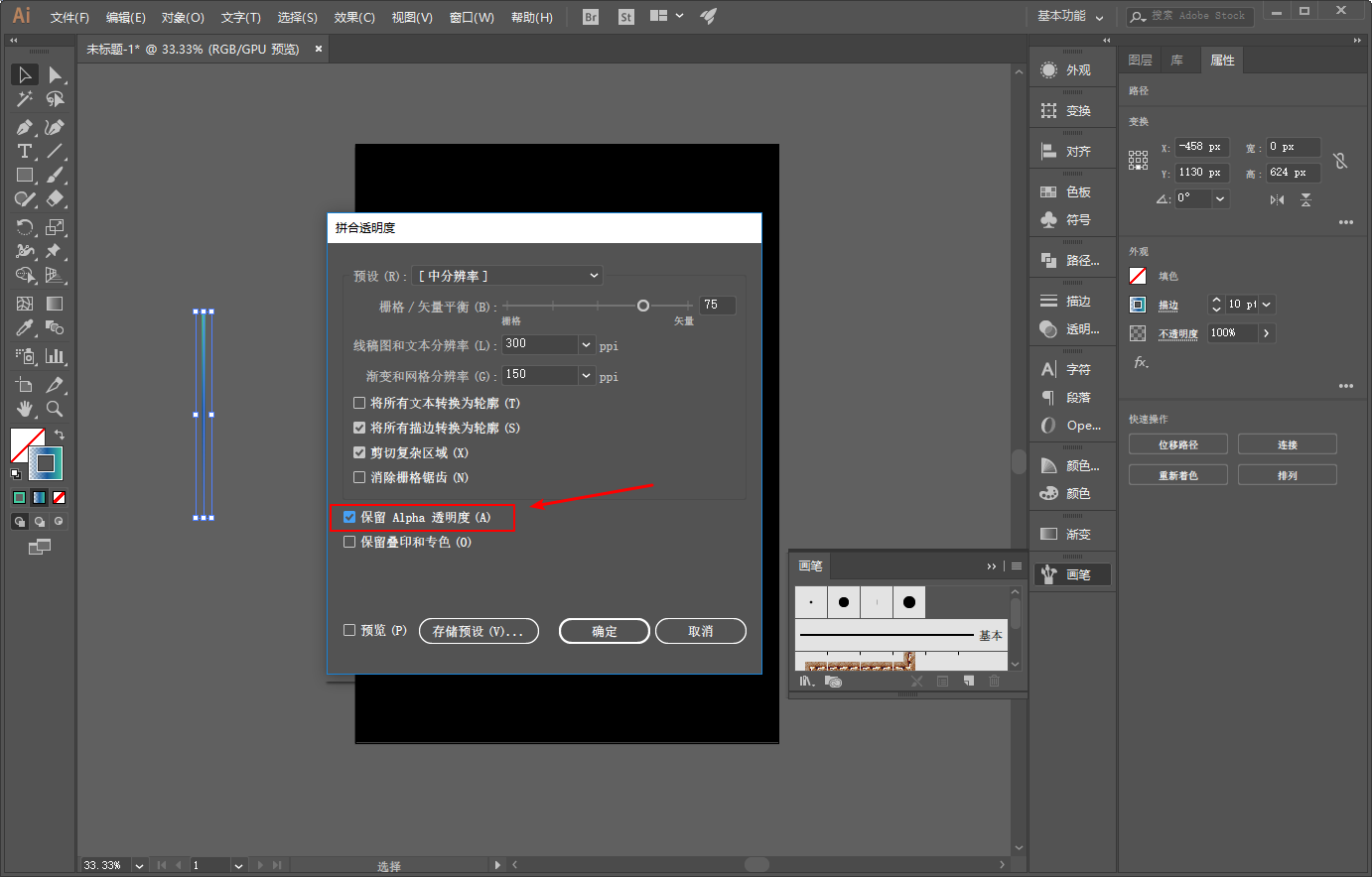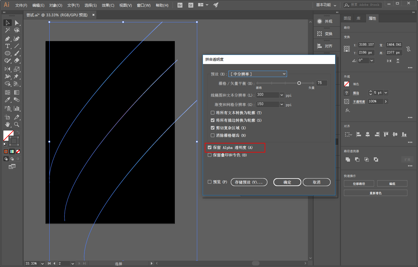 同样选中三条线段以后,执行对象-拼合透明度,同时勾选保留Alpha透明度: