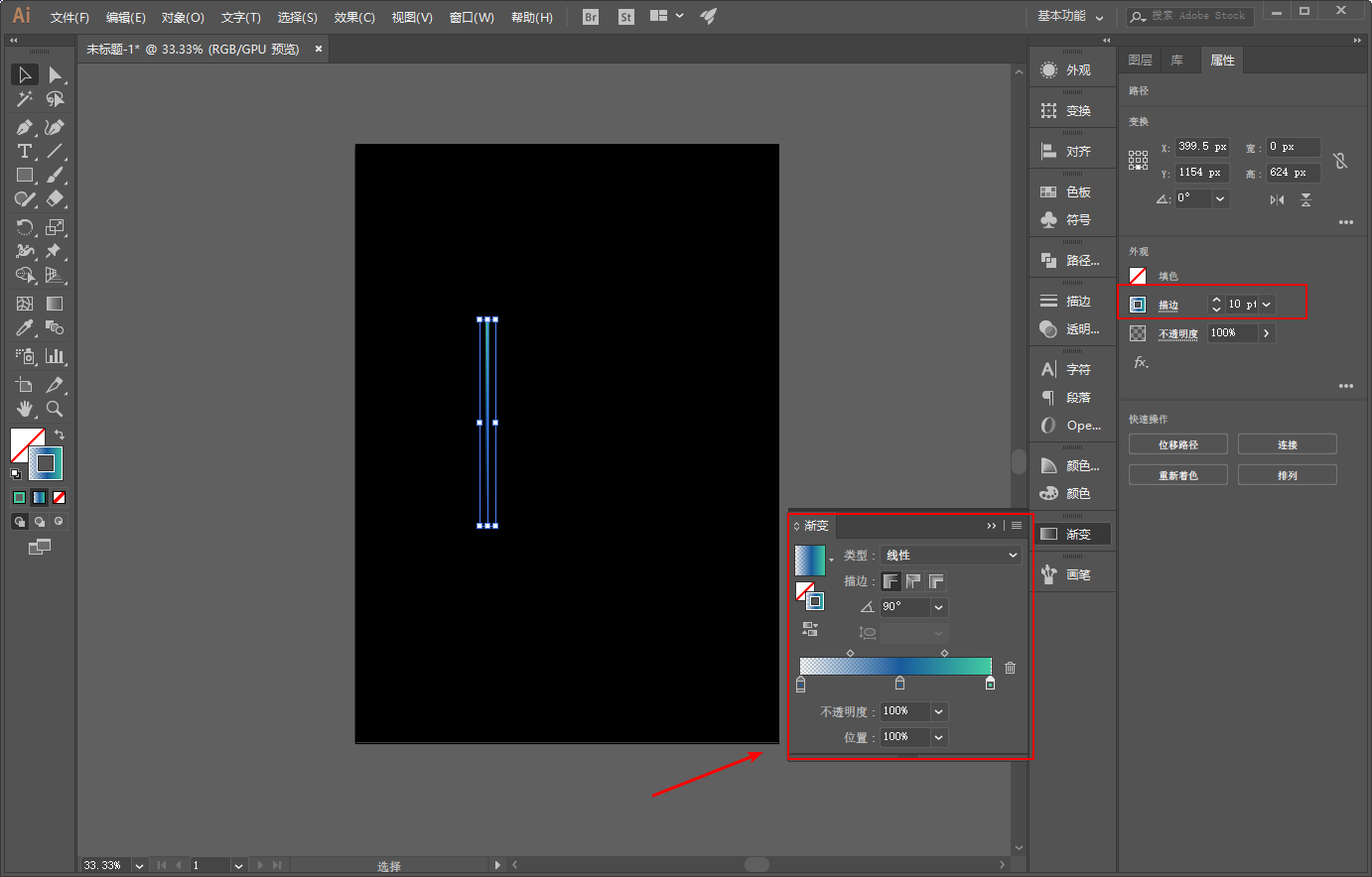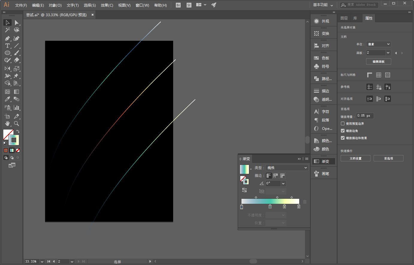 如图所示用钢笔工具画一条直线,野教无填充,描边设置为自己喜欢的渐变色,粗细的话大家看着办就好:
