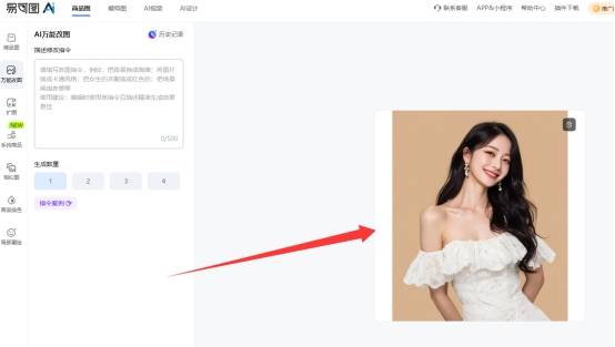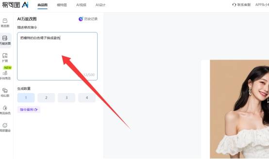 易可图提供了 AI 万能改图功能,可以用于局部替换、元素移除以及颜色修改等需求。这个功能使用起来非常简单,只要用文字描述我们的改图需求就可以了,不需要复杂的修图基础。