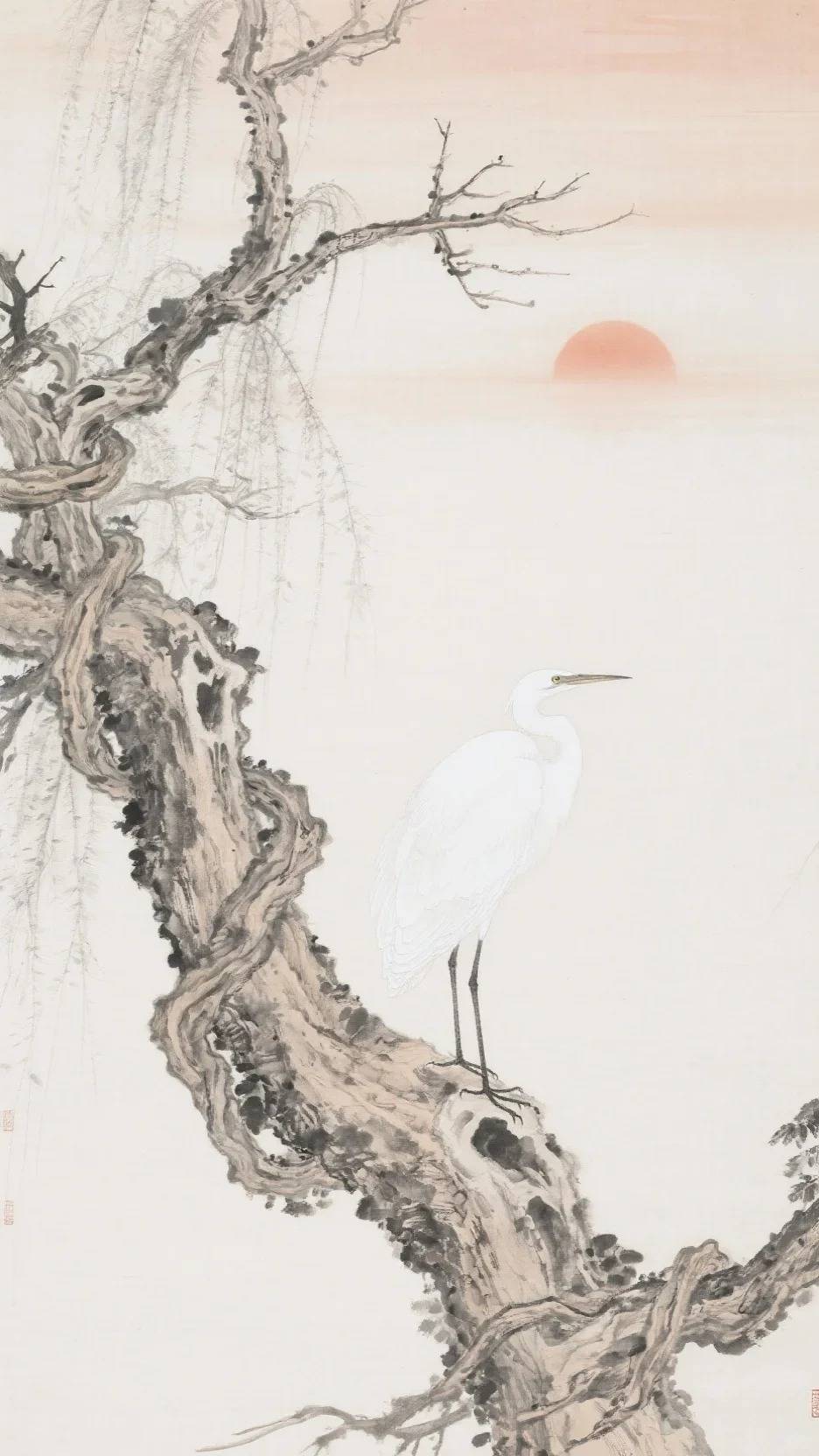 P3:枯藤缠绕的古木,一只白鹭静立于枝头,极简留白背景中一抹浅绛色夕阳晕染,飞白线条暗示微风吹动枝叶,水墨渗染表现树皮质感