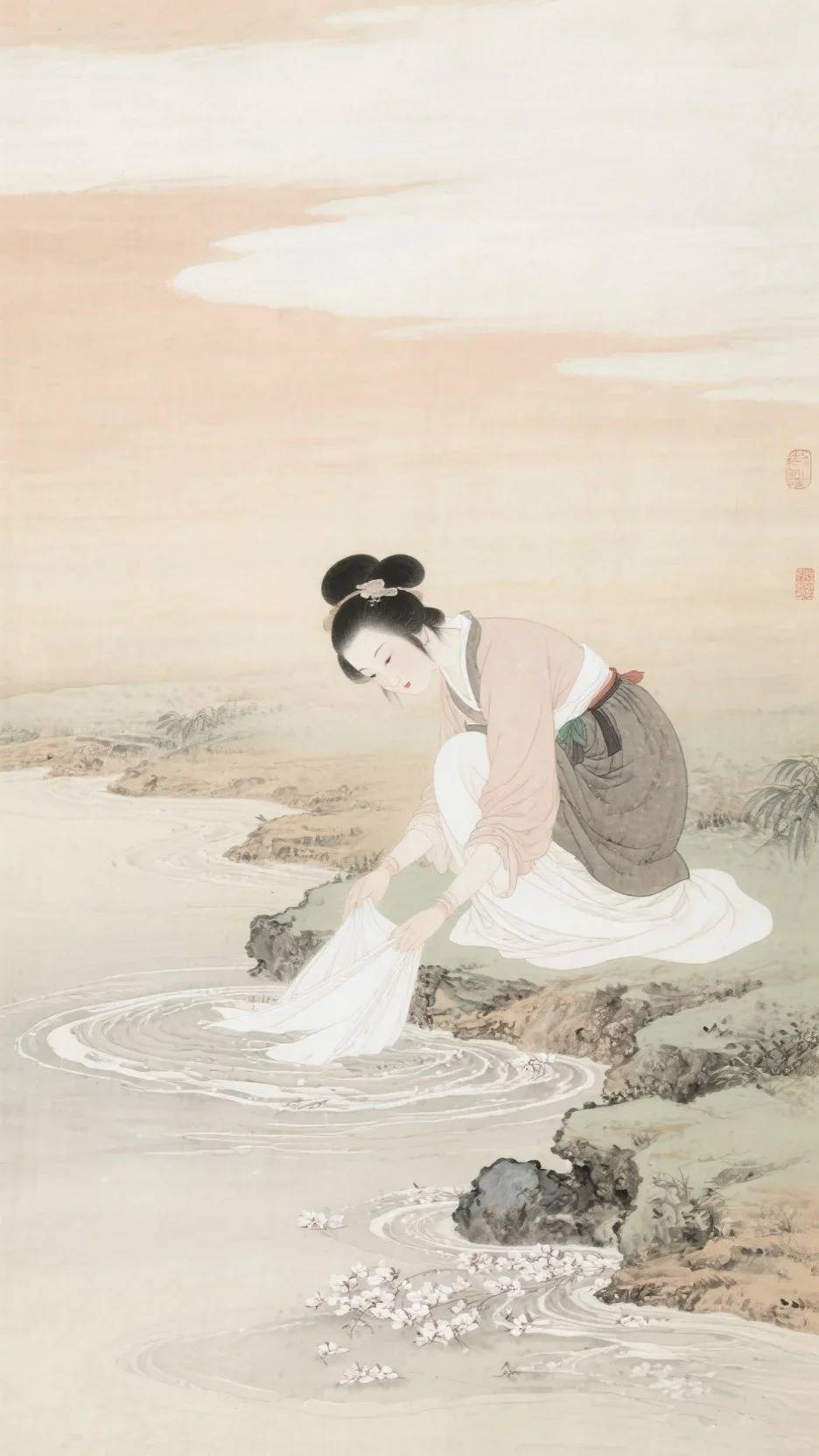 P4:溪边浣纱女子,细笔勾勒衣褶与动作,水渍留白表现溪水流动,飞白线条暗示风吹落花,浅绛色平涂天光倒影,描绘出岸边青石质感;
