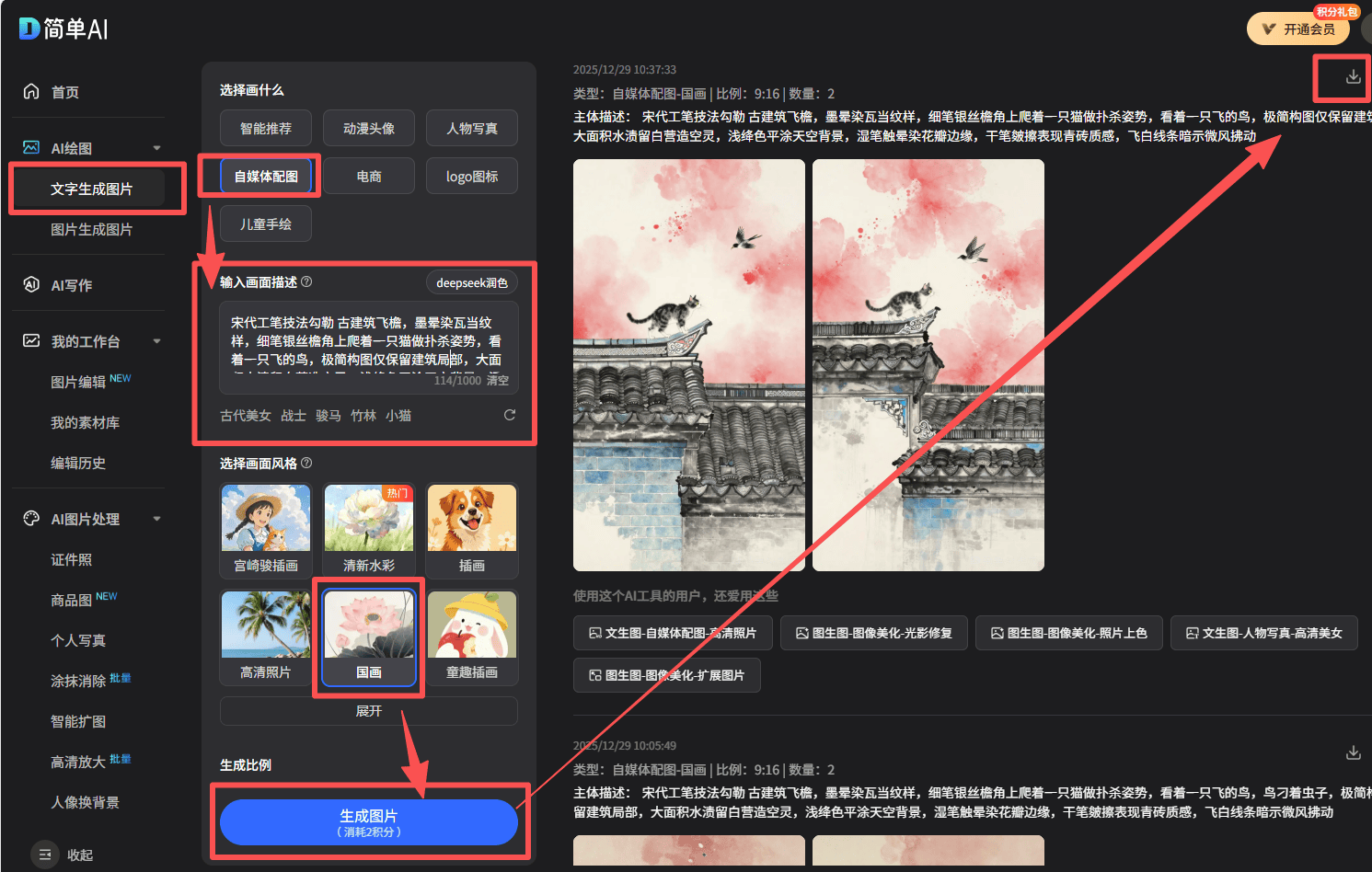 🎯 小结:生成好看的古风工笔国画,留白是古风国画意境关键,一定要写进提示词!教程其次,体新图神对意象、手配画面氛围的文字描述也不能少,抽象一点也没关系~ 最重要的是,把这些咒语直接输入【搜狐简单AI】的文字生成图片功能,不用复杂设置,就能快速产出符合要求的自媒体国画配图,效率拉满!✨
