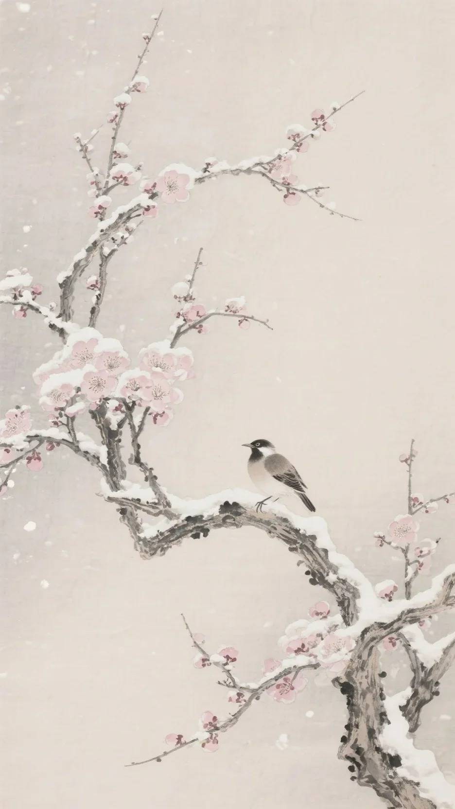 P2:一树梅花,枝头寒梅带雪,一只鸟栖枝头,干笔皴擦表现寒枝苍劲,湿笔晕染花瓣边缘,空白背景营造雪夜寂静氛围,浅粉与灰墨对比呈现冷暖交融;