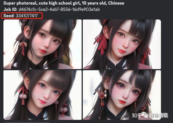 seed值是Midjourney生成图片的起始值,如果在提示词中不指定seed值,每个图片的起始值都是随机的,所以每次出图会产生随机的结果我们可以为图片指定seed值,使用了相同seed值的图片,就会产生相似的结果seed值只对V4、V5、Niji版本生效举个例子: