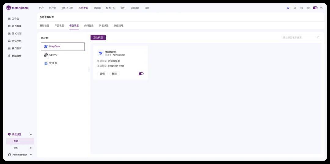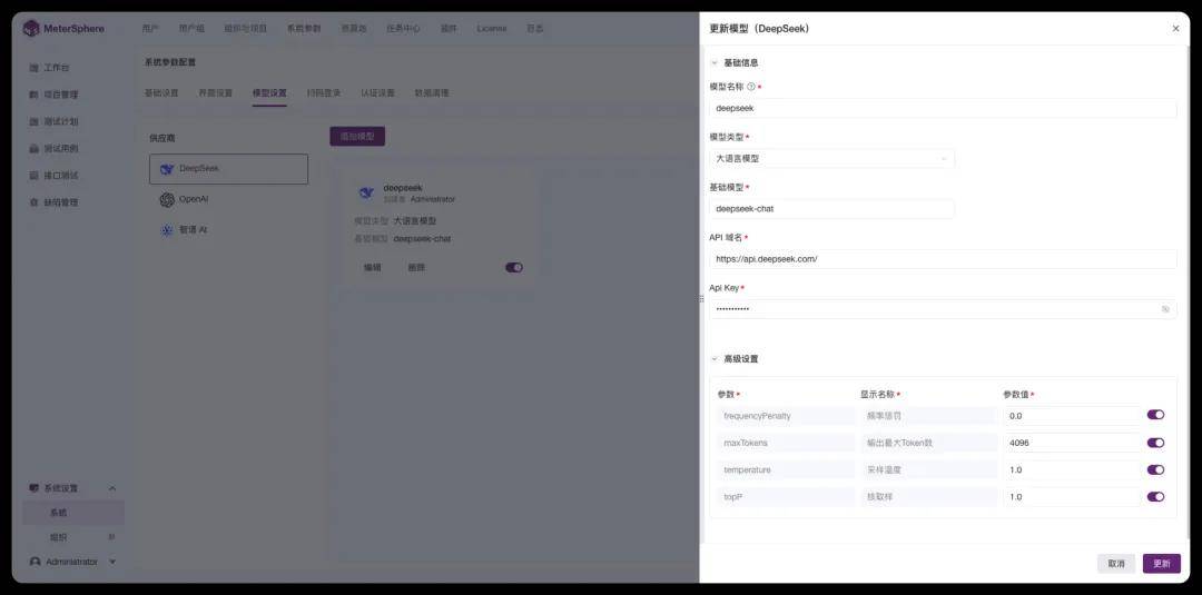 MeterSphere目前支持添加三个供应商的模型,分别是DeepSeek、OpenAI和智谱AI。在添加模型时,选择供应商后,点击“添加模型”按钮,即可打开“添加模型”对话框。基础模型提供默认选项,如果想添加其他模型可以直接输入模型的名称,API域名和API Key则需要通过对应的账号获取。