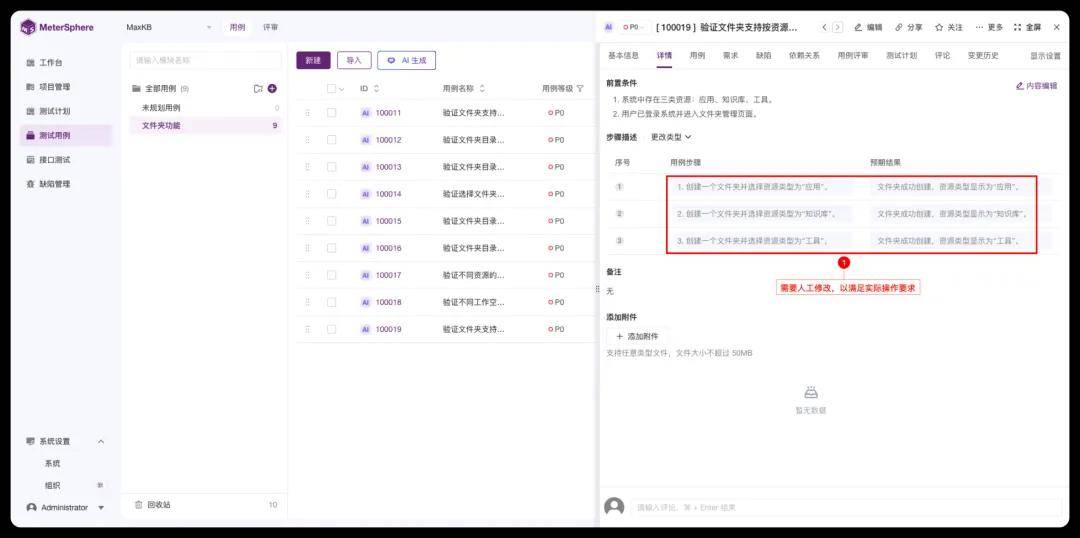 在用例审核时我们发现,“验证文件夹在不同资源之间独立”的用例,其操作步骤与实际不符,我们可以手动对其进行修改,以符合实际操作步骤。
