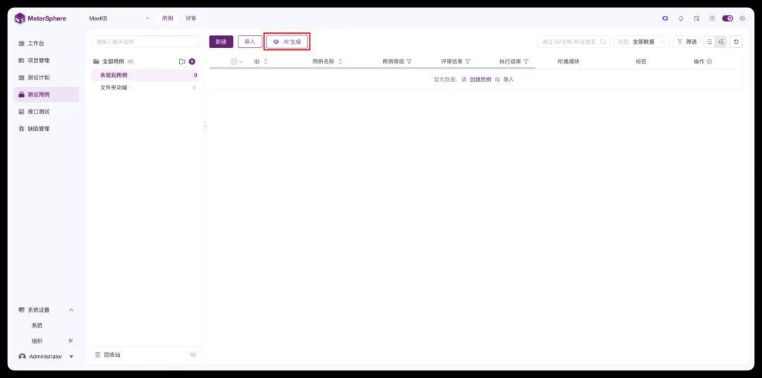 在MeterSphere中配置好大语言模型并启动后,在“测试用例”模块中会展示“AI生成”功能按钮,点击后,即可进入AI生成用例界面。