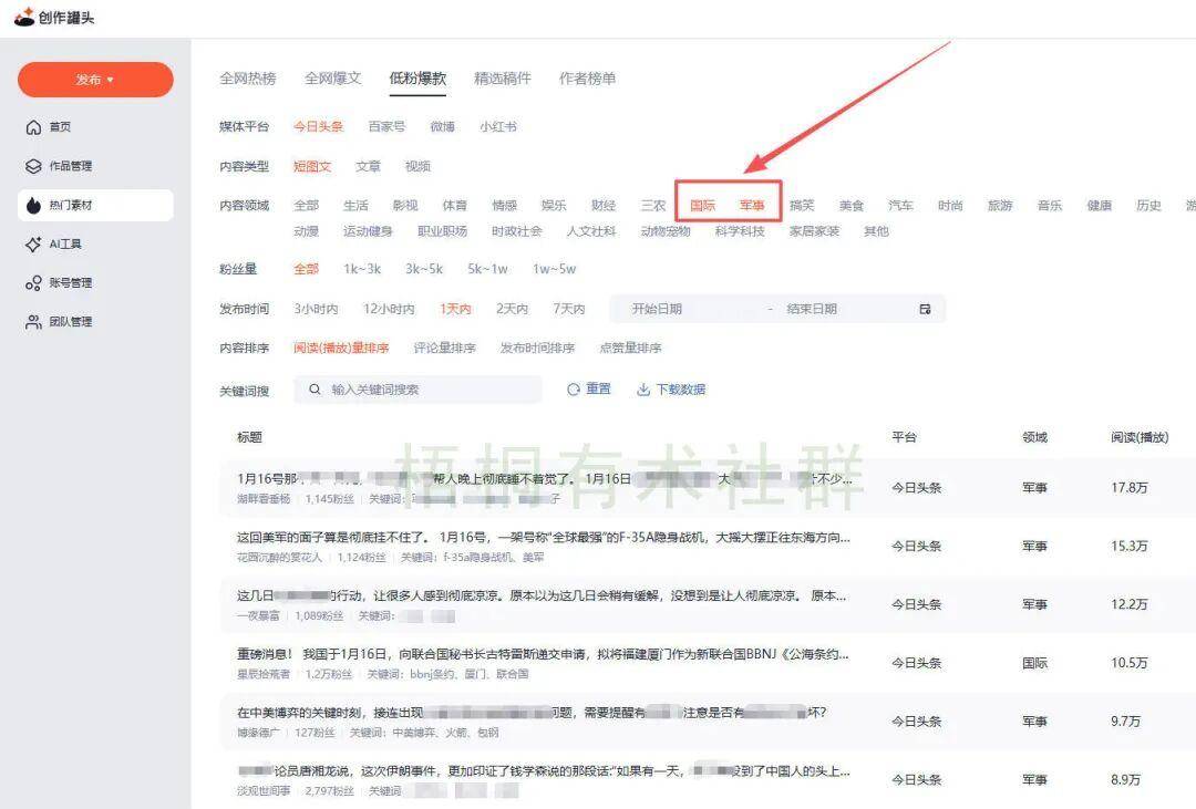 点击后台的“低粉爆款”选项,会出现很多不同领域,咱们同时勾选“国际”和“军事”两个分类,出来的内容,都是新手账号发布的爆款文章。这类内容,是最容易爆的,新手跟着做准没错。