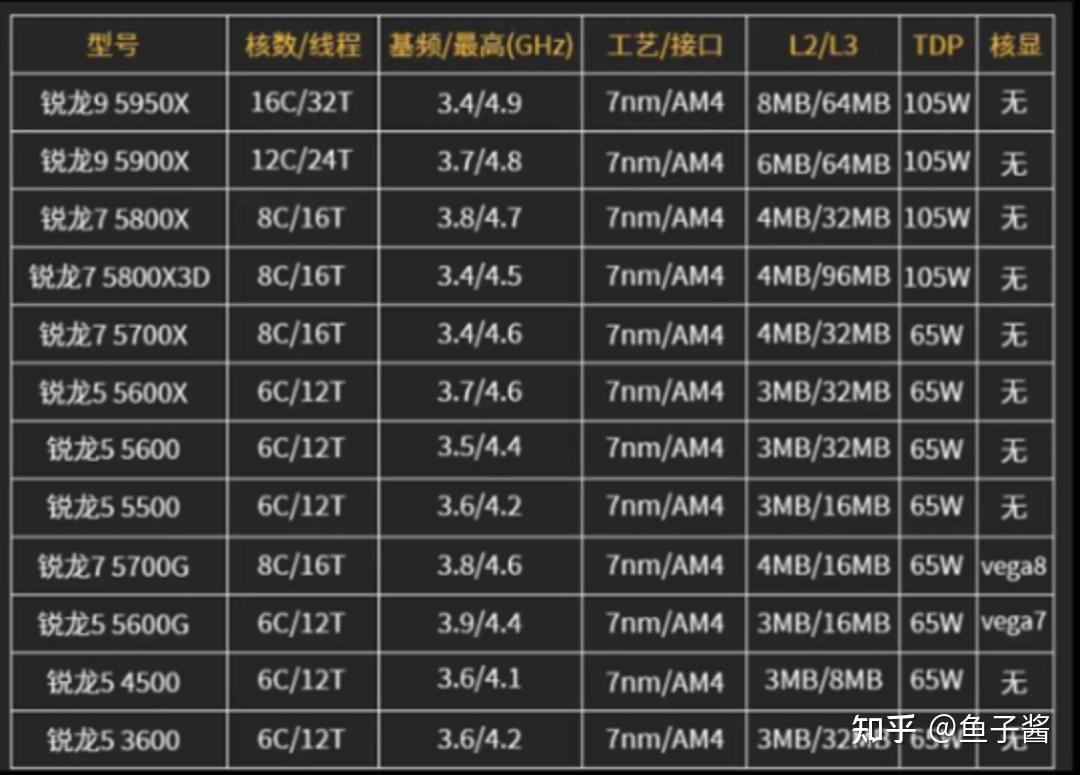 2)AMD锐龙系列:R3(入门办公), R5(主流), R7(高端), R9(发烧级).eg: 5700x, 5900x...