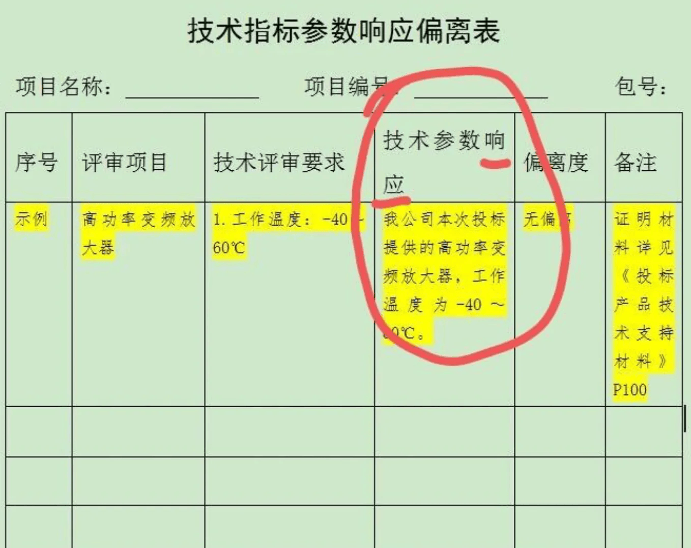 1)偏离表:设备参数响应**,**别只写“完全响应”,要列个偏离表。