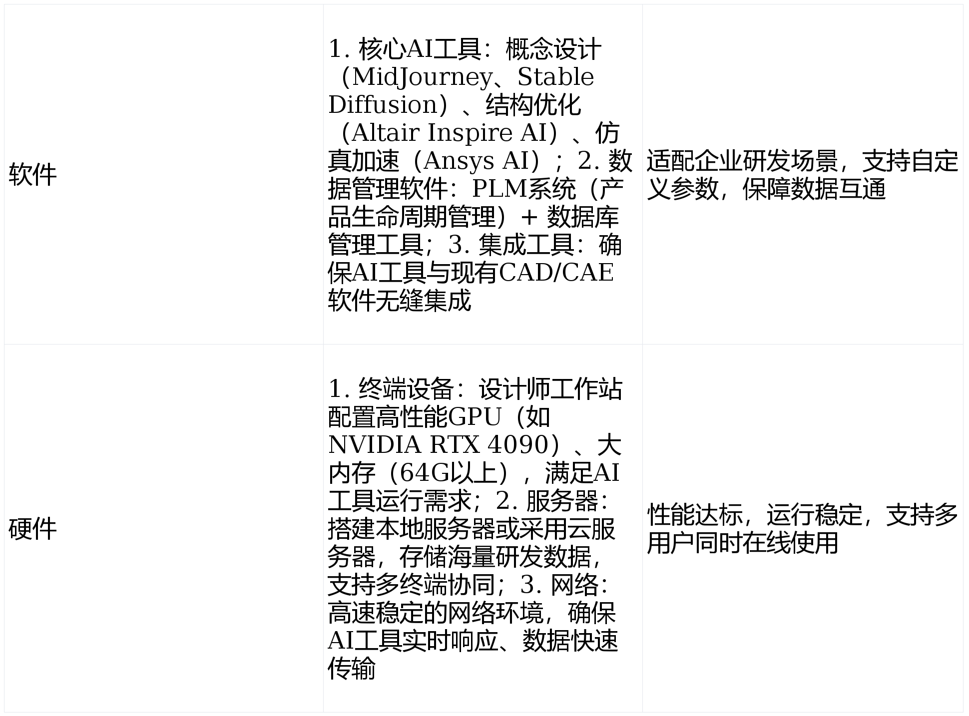 • 数据治理先行:AI落地的核心是数据,需梳理研发设计全流程数据(概念方案、结构参数、仿真数据、工艺数据等),建立标准化数据库,确保数据的准确性、完整性;同时搭建数据安全体系,通过加密存储、访问权限管控,防止核心设计数据泄露。 • 选择适配的AI技术路径:中小企业建议采用“轻量化AI工具+现有设计软件集成”模式(如将AI概念设计工具与SolidWorks、AutoCAD集成),降低投入成本;大型企业可联合AI厂商定制开发专属AI平台,适配企业个性化研发需求。 • 保障技术兼容:确保AI工具与现有研发软件、硬件系统兼容,避免出现“数据无法互通、工具无法联动”的问题;同时建立技术应急预案,应对AI工具故障、数据丢失等突发情况。5. 软硬件配置:按需适配,平衡性能与成本