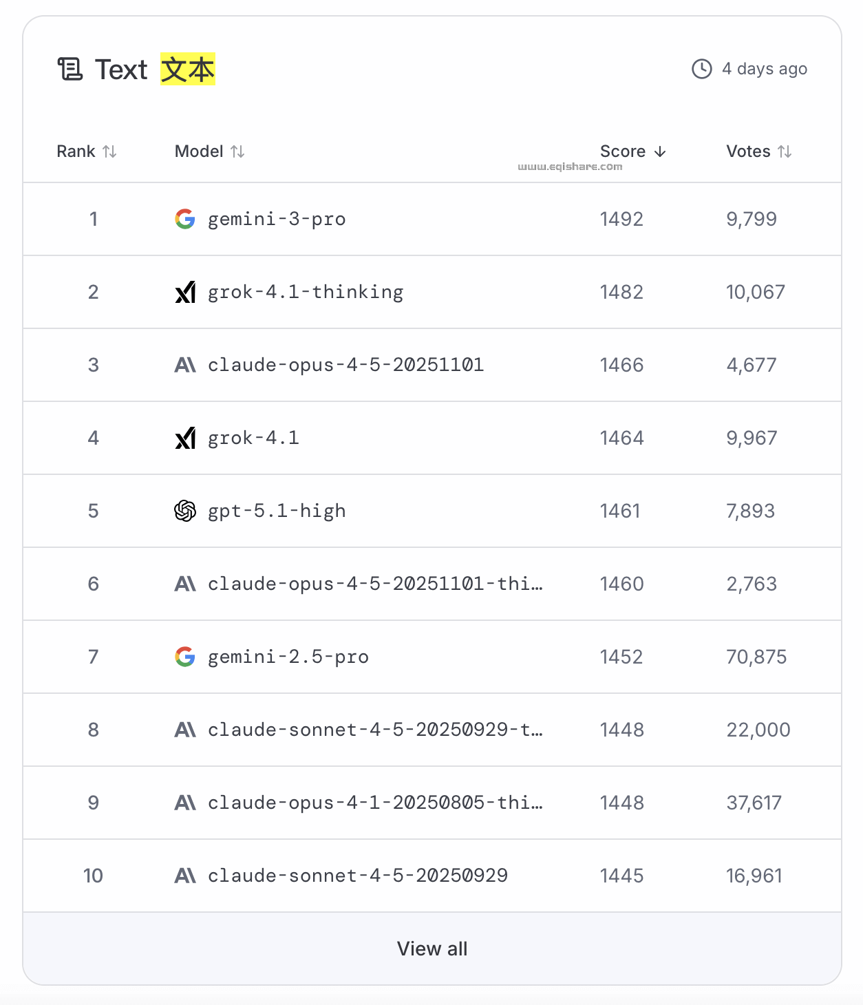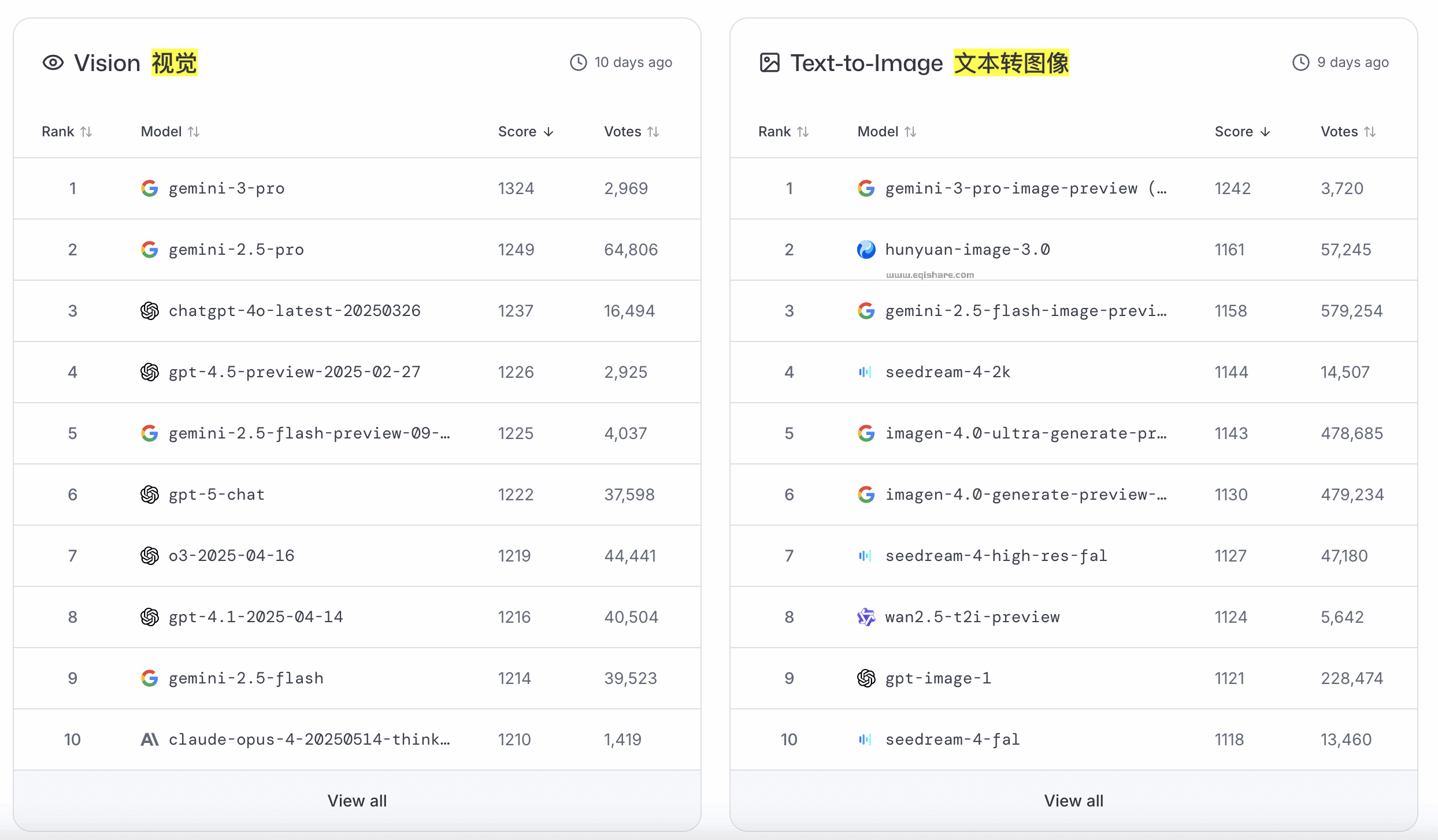 根据用户的投票,在不同模型文本、视觉、搜索、图片编辑、文本转视频、图片转视频领域的排名表现。