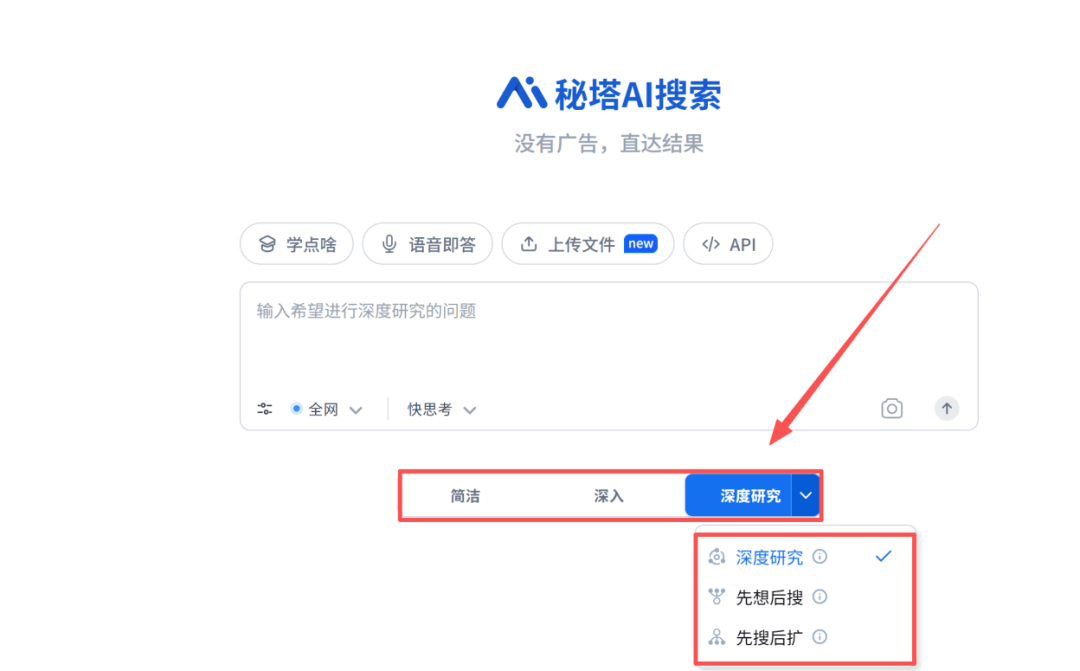 秘塔AI提供多种搜索模式:简洁、深入和深度研究。简洁模式主要获取要点式答案,适合日常查询;深入模式提供详细解释与关键数据;深度研究模式可用于输出结构化报告、思维导图并附上引用链接,适合学术论文写作。用户可以根据个人实际需求选择合适的搜索模式。