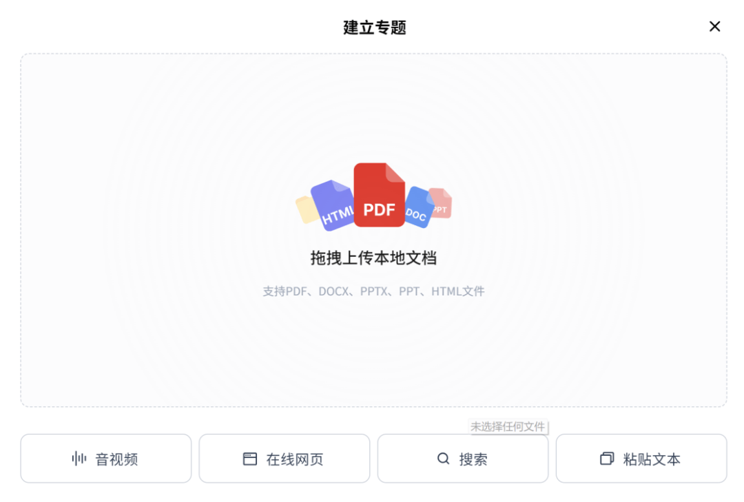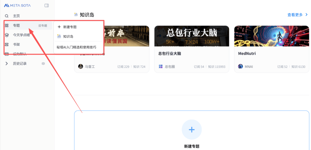 另外,用户点击侧边栏的“专题”,可以新建专题,构建个人专属知识库,实现定制化功能。