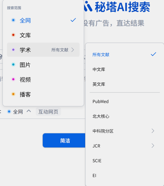 其中,“学术”的搜索范围可以涵盖中、英文库,提供专业期刊和论文库来源,为科研提供支持。