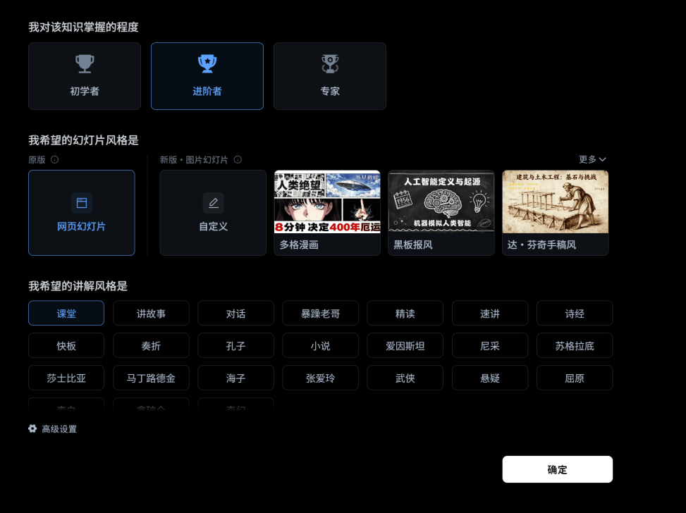 在秘塔AI的“今天学点啥”功能里,它能将各种文档和资料在几十秒内变成个性化的在线视频课。用户可以根据自己的知识水平选择“初学者”“进阶者”或“专家”模式,并挑选超过20种讲解风格(如“课堂模式”“暴躁老哥”等),甚至可以选择讲解语言和音色,能够提供生动丰富的学习体验。