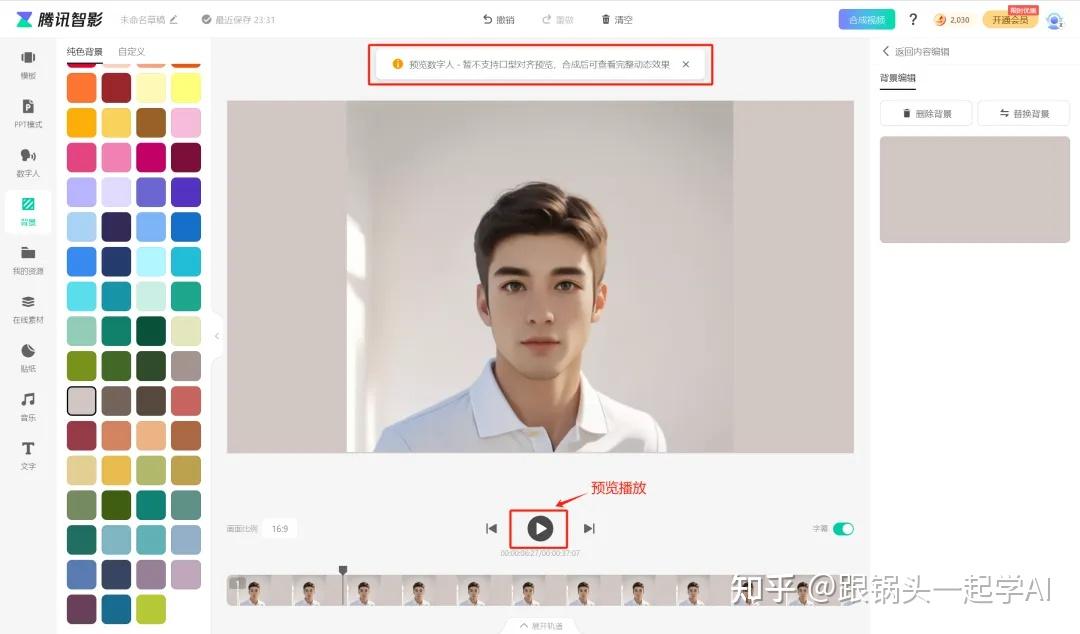 点击【播放】图标,预览播放效果,不过“预览数字人,暂不支持口型对齐预览,合成后可查看完整动态效果”。