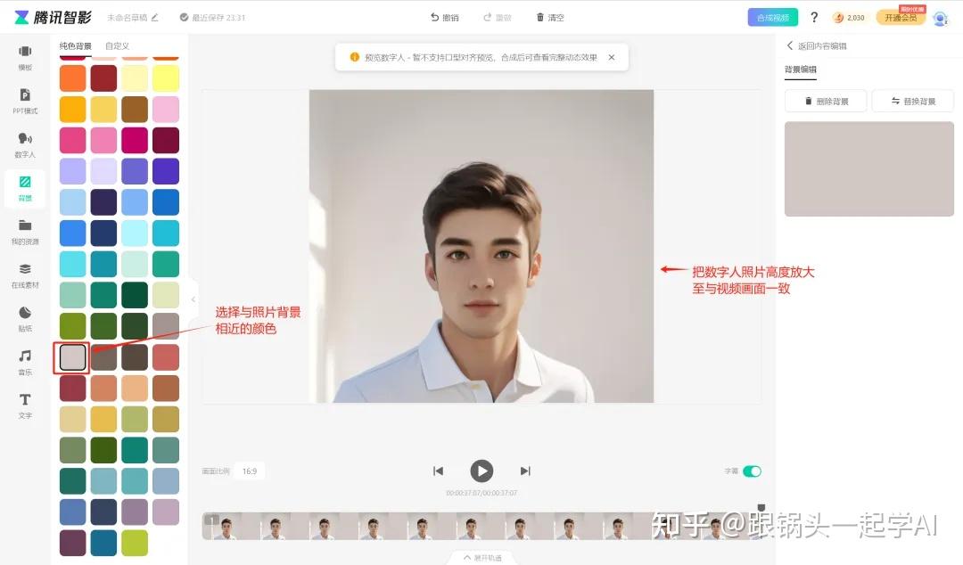 选择与照片背景相近的颜色,同时把数字人照片高度放大至与视频画面一致。