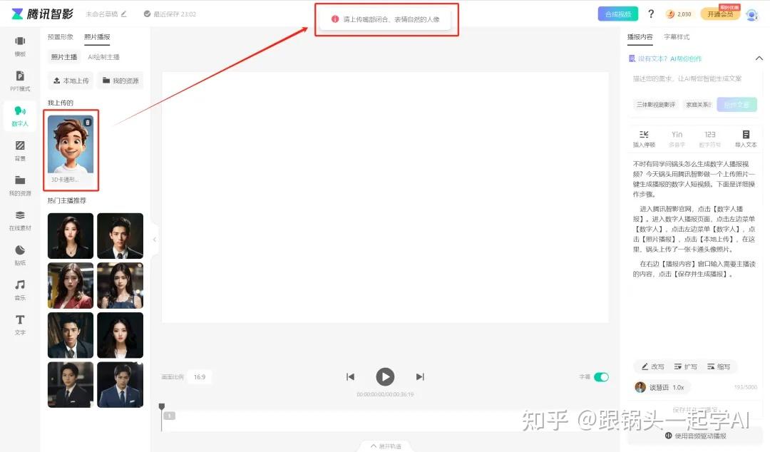 锅头选择刚才上传的卡通照片时,提示“请上传嘴部闭合,表情自然的人像”。