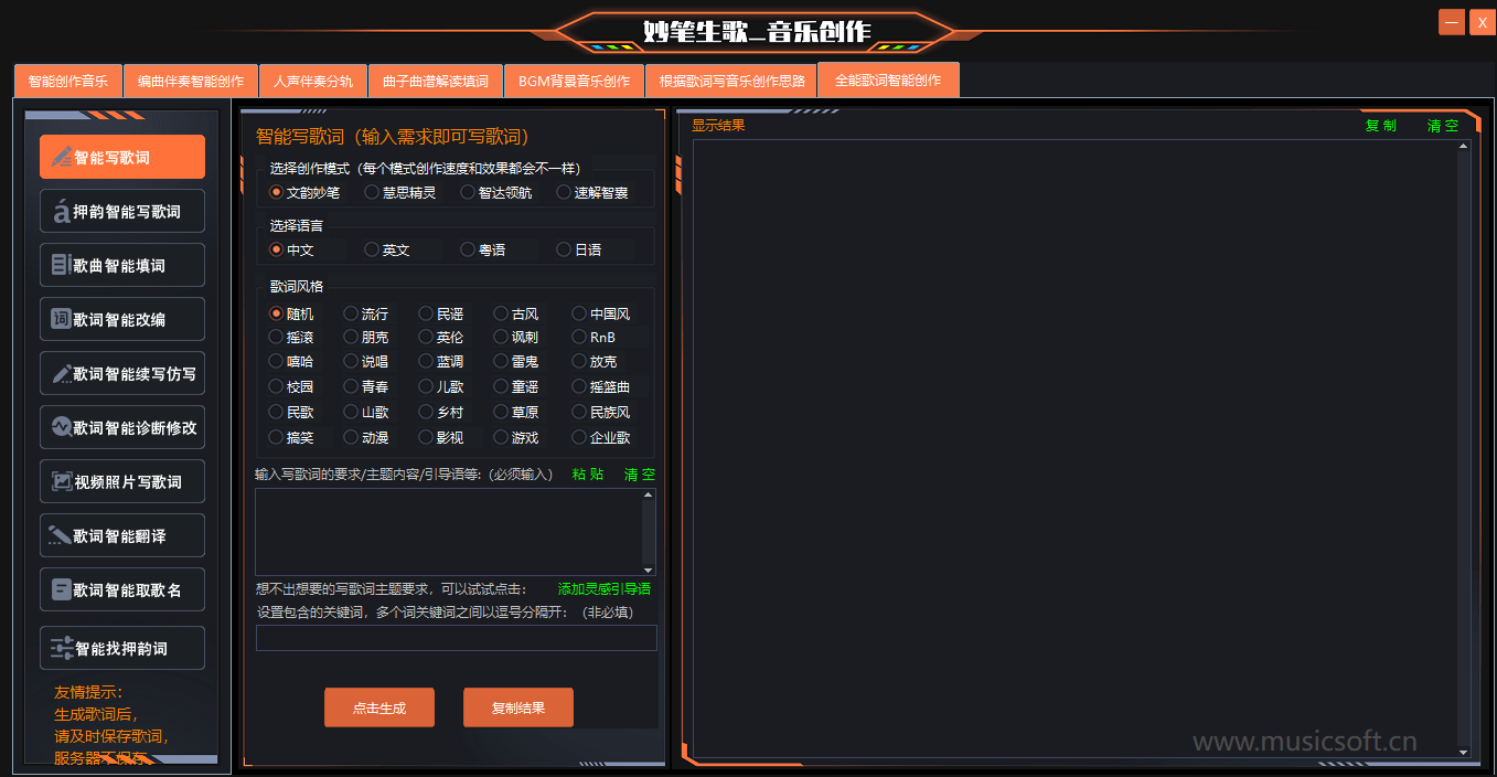 另外,如果你有歌词,也可以同时输入到软件中。这样,软件在生成音乐时会充分考虑歌词的节奏和情感,使音乐与歌词更好地融合。在这一步,不要过于担心自己的素材是否完美,“妙笔生歌”强大的算法会对其进行优化和完善。
