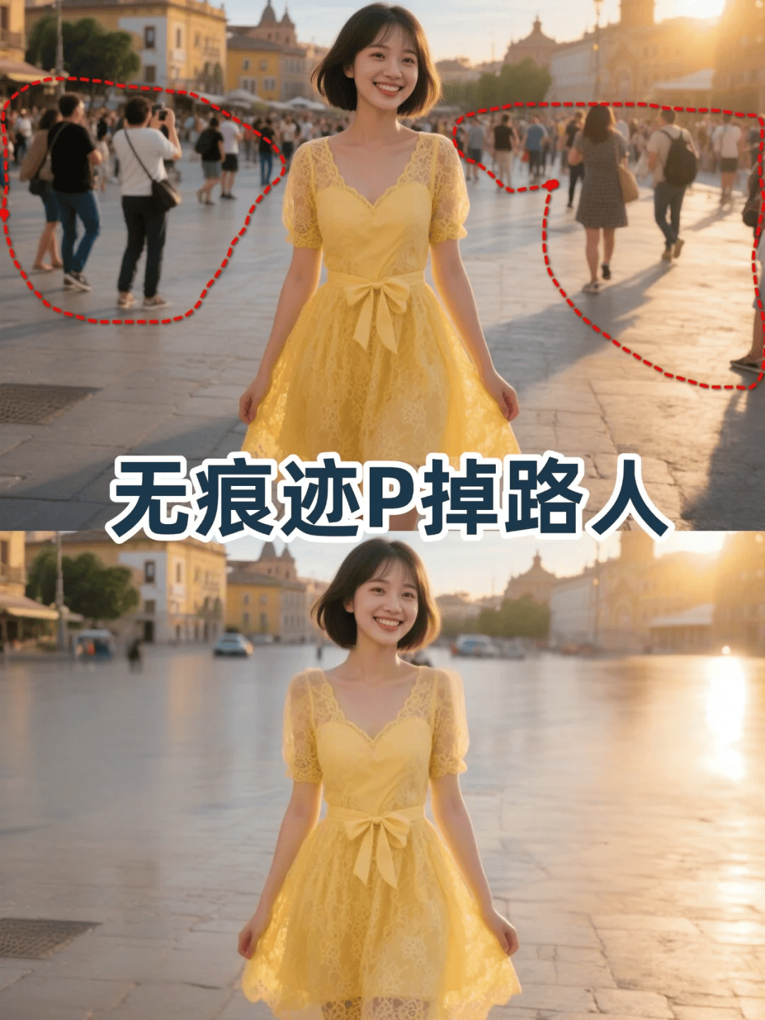 👉 旅游照刚发朋友圈,才发现角落有个乱入的片去片秒片路人,画面瞬间变杂乱;