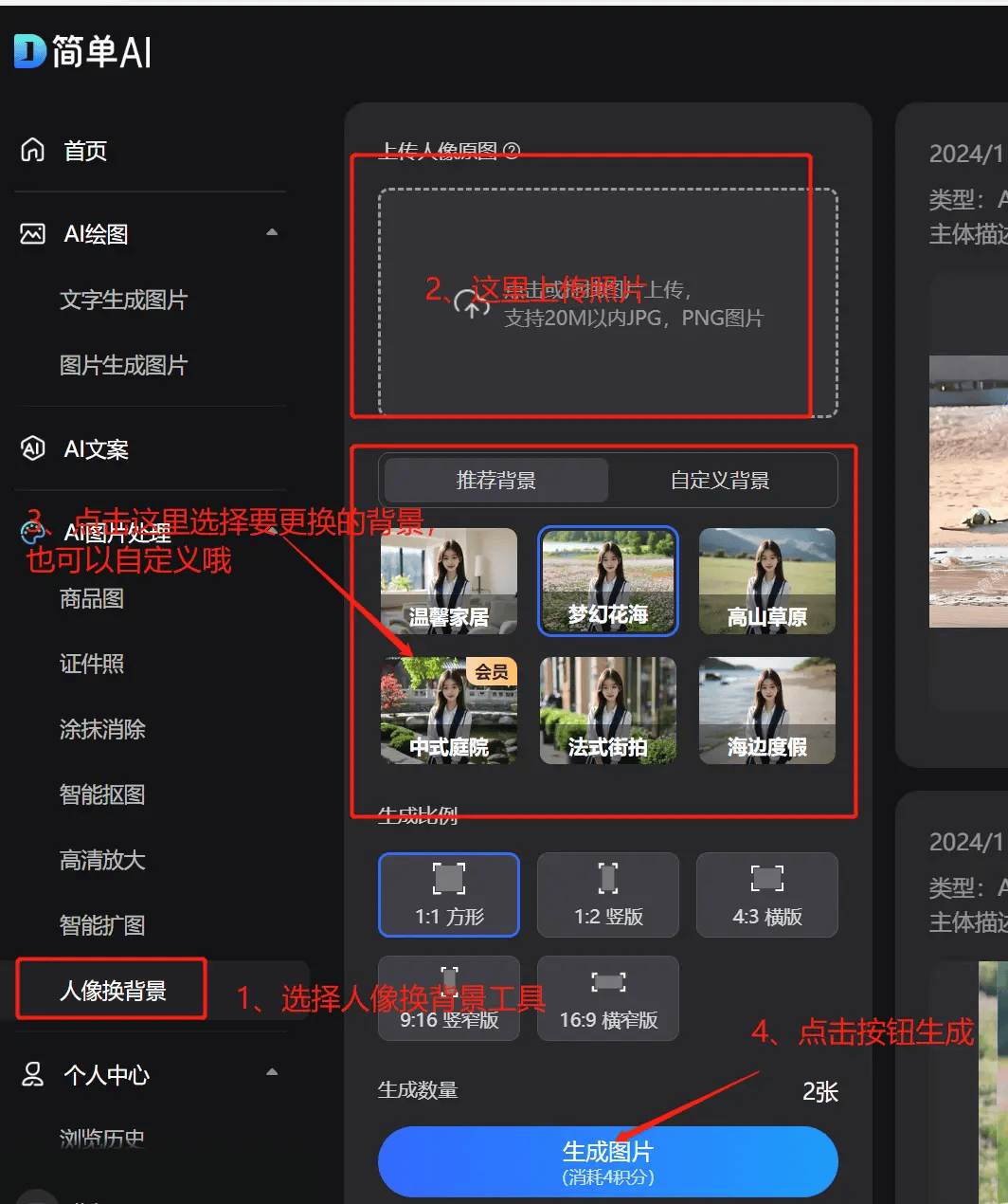 选择【人像换背景】→上传照片→选择想要更换的背景(也可以选自定义哦)→选择比例+数量-点击【生成图片】→下载