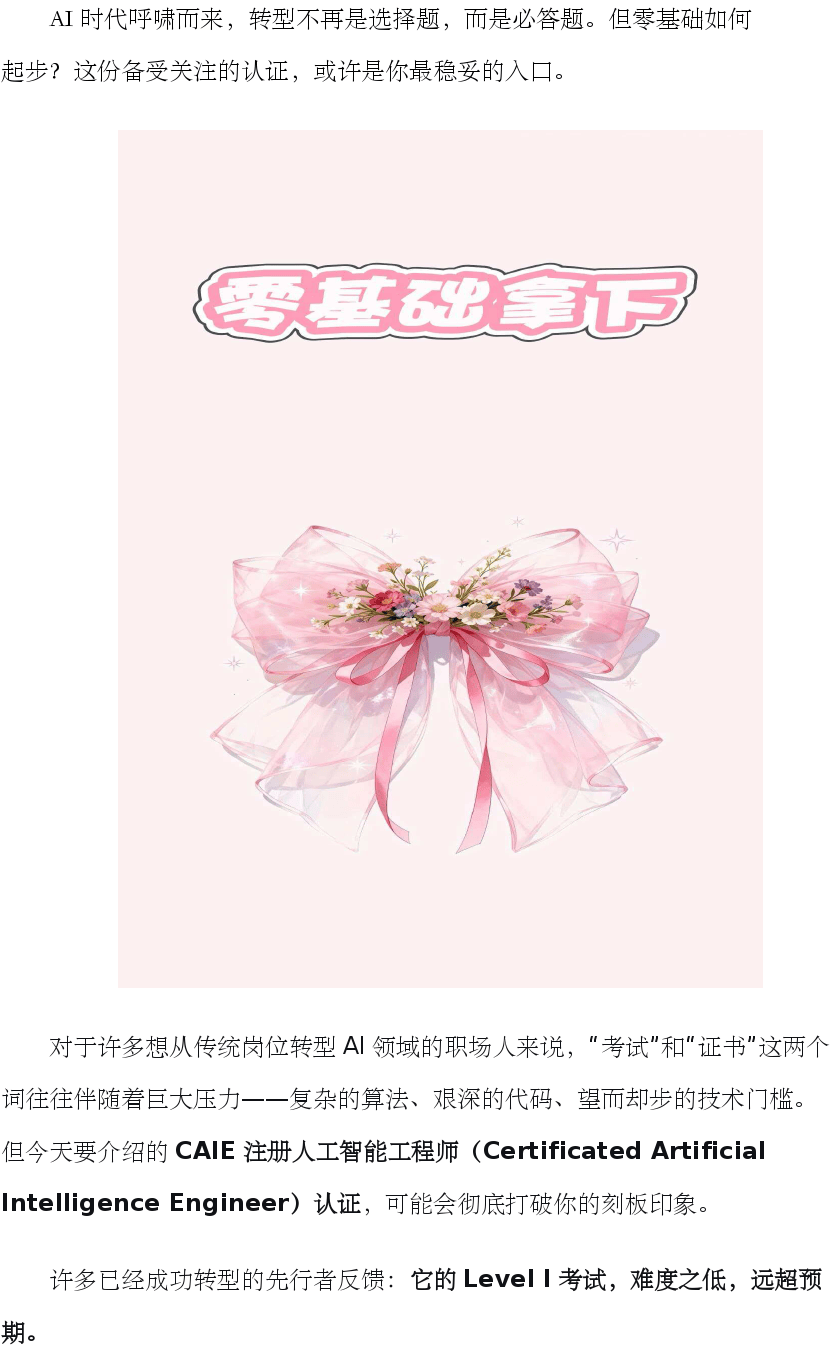 1. 轻敌是最大敌人:难度低不代表可以不复习。裸考通过率极低,扎实学习是唯一途径。 2. 警惕过时资料:AI领域更新极快,务必认准官方发布的最新大纲和资料,避免被旧资料误导。 3. 切勿死记硬背:理解概念背后的应用场景,远比记住抽象定义重要。 4. 明确考试目标:Level I是“入门认证”,目标是建立认知框架和基础应用能力,而非成为技术专家。摆正预期,学习会更轻松。五、一张证书之外,真正的收获是什么?