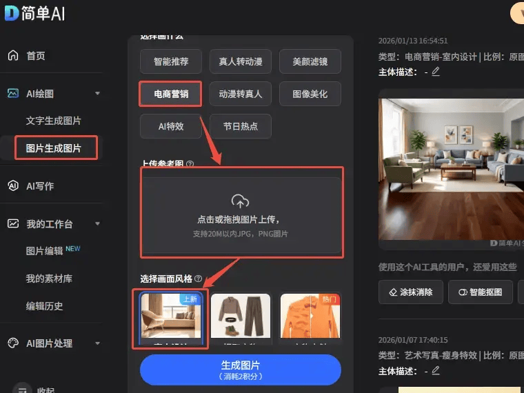 💻第二步,果图上传到搜狐简单AI。键生打开搜狐简单AI小程序或网页版,成太点击“图生图-电商营销-室内设计”,然后把刚才拍的毛坯图上传上去。是不是超级简单?