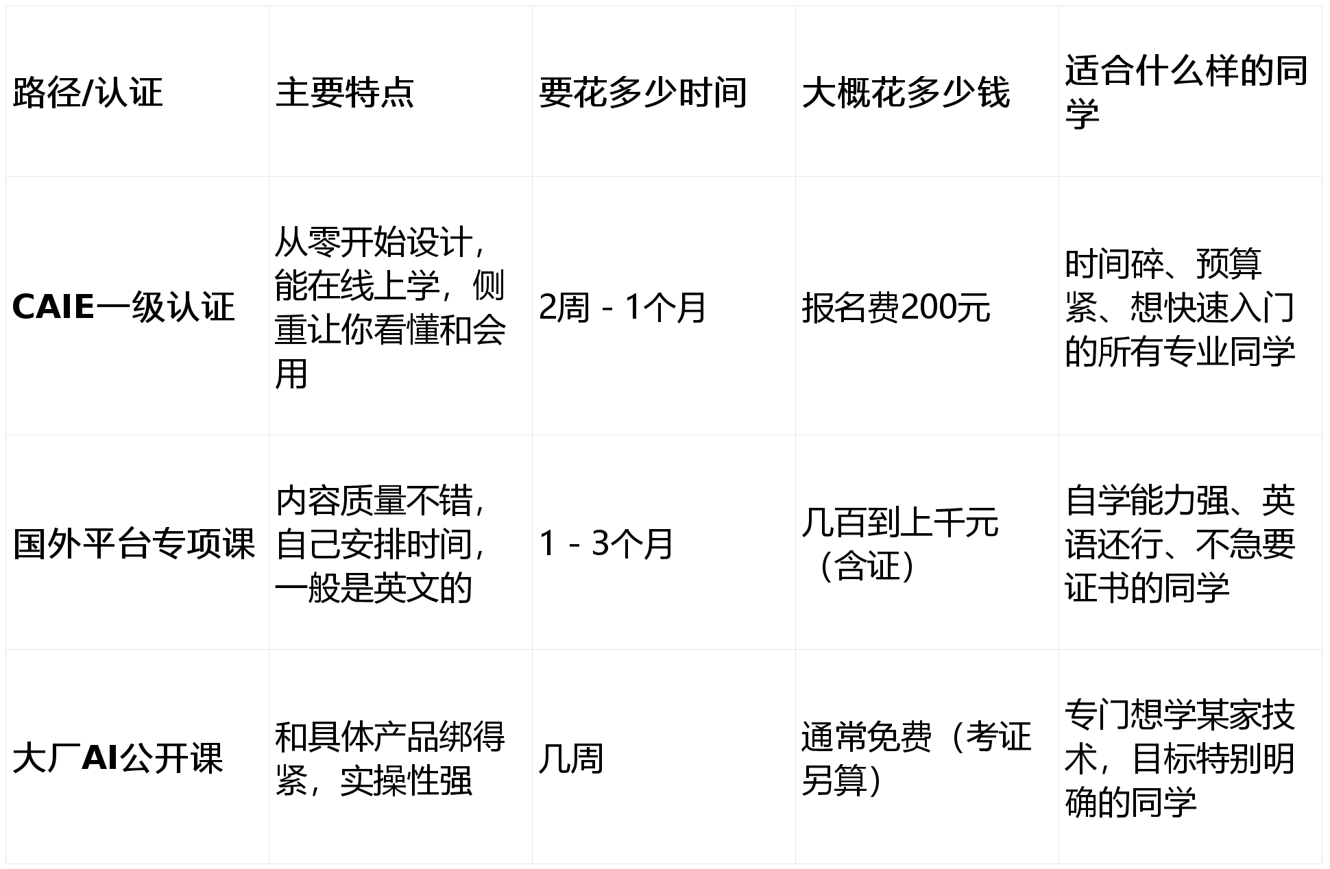 A:这得看你想要什么。Google、微软那些大厂的认证,在技术圈里认可度确实高,但通常也更难、更耗时、更贵。而入门定位的CAIE认证,更像一个通识教育的毕业证,帮你打下广泛的基础。两者没有绝对的高下,只是适合不同阶段和不同目标的人。对于时间紧张、想低成本试错的同学来说,可能后者更实际一点。