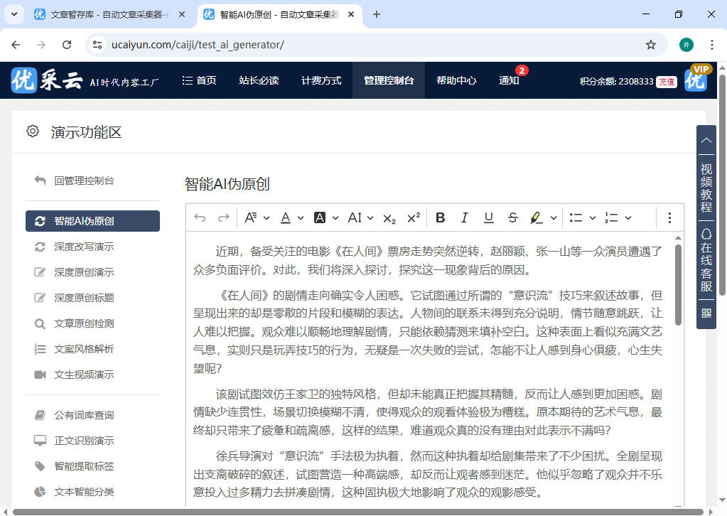展开全文优采云有个“深度原创”系统。它不是简单的同义词替换。据说是篇章级别的改写,原创度能提到很高。而且,它还能参考网络热点,给文章“加热”。