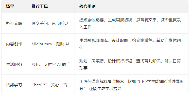 按场景选工具,拒绝盲目跟风不同 AI 工具的核心优势不同,针对性选择能大幅降低使用门槛,以下是常见场景的工具推荐: