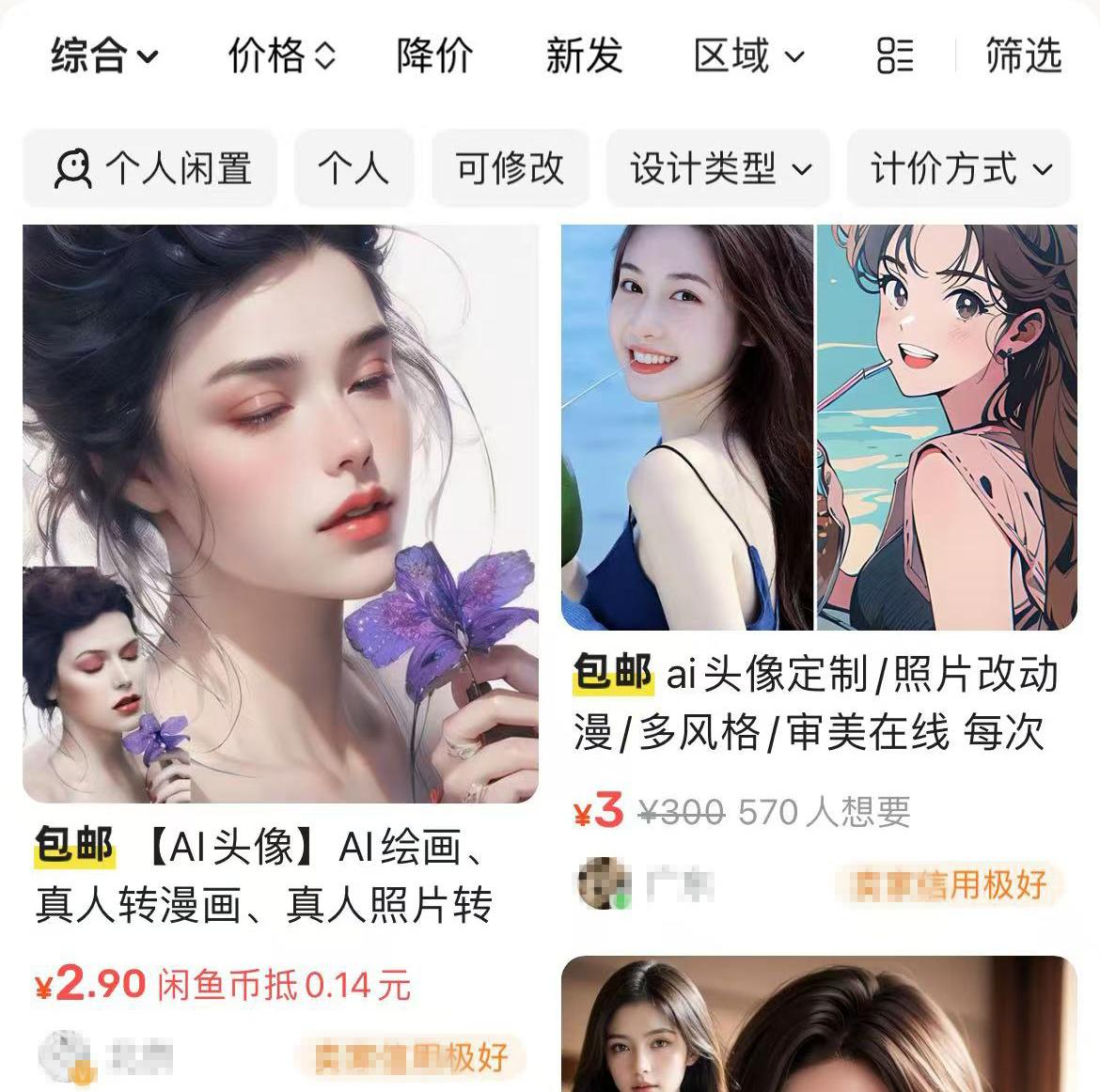 可以直接在闲鱼平台看到,有不少直接标明Ai头像的收费服务。相较一般的绘画服务,Ai绘图的收费肯定低很多。但如果能训练出没有“Ai味”的图像模型,就能把价格拔高了。