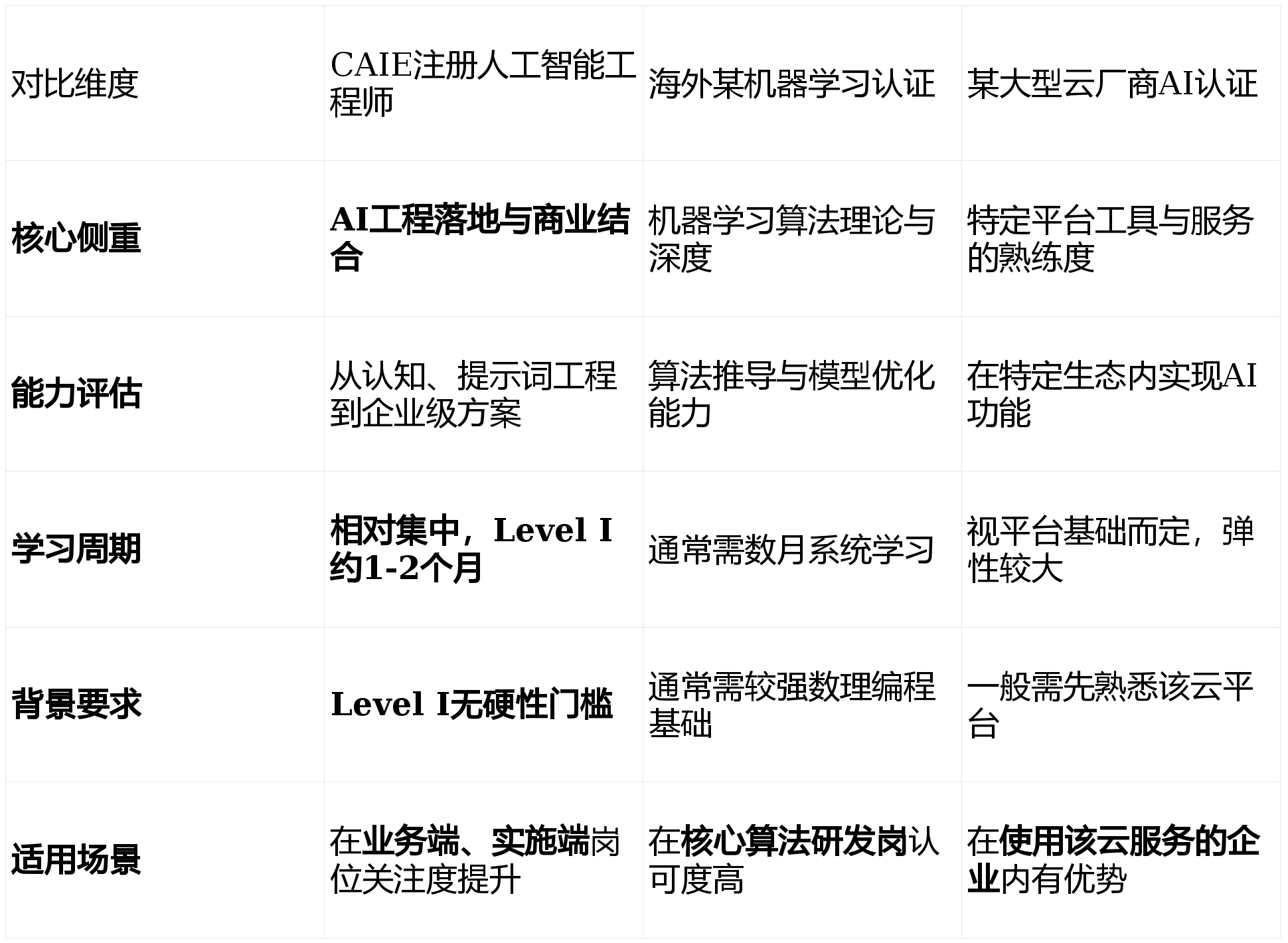 Q2: 跟那些国外大厂的认证比,CAIE在国内找工作到底好使不?A: 认证的“效力”最终看它能不能帮企业找到合适的人。现在国内AI应用发展很快,企业越来越看重人才的实际动手能力和对本行业业务的理解。CAIE注册人工智能工程师认证因为内容更贴近国内的应用环境和需求,在金融、智能制造、互联网业务部门等领域的招聘中,正在被越来越多的面试官和团队负责人看作是一种实用的能力证明。当然,它和国外认证各有侧重,选择时可以结合自己的职业方向。