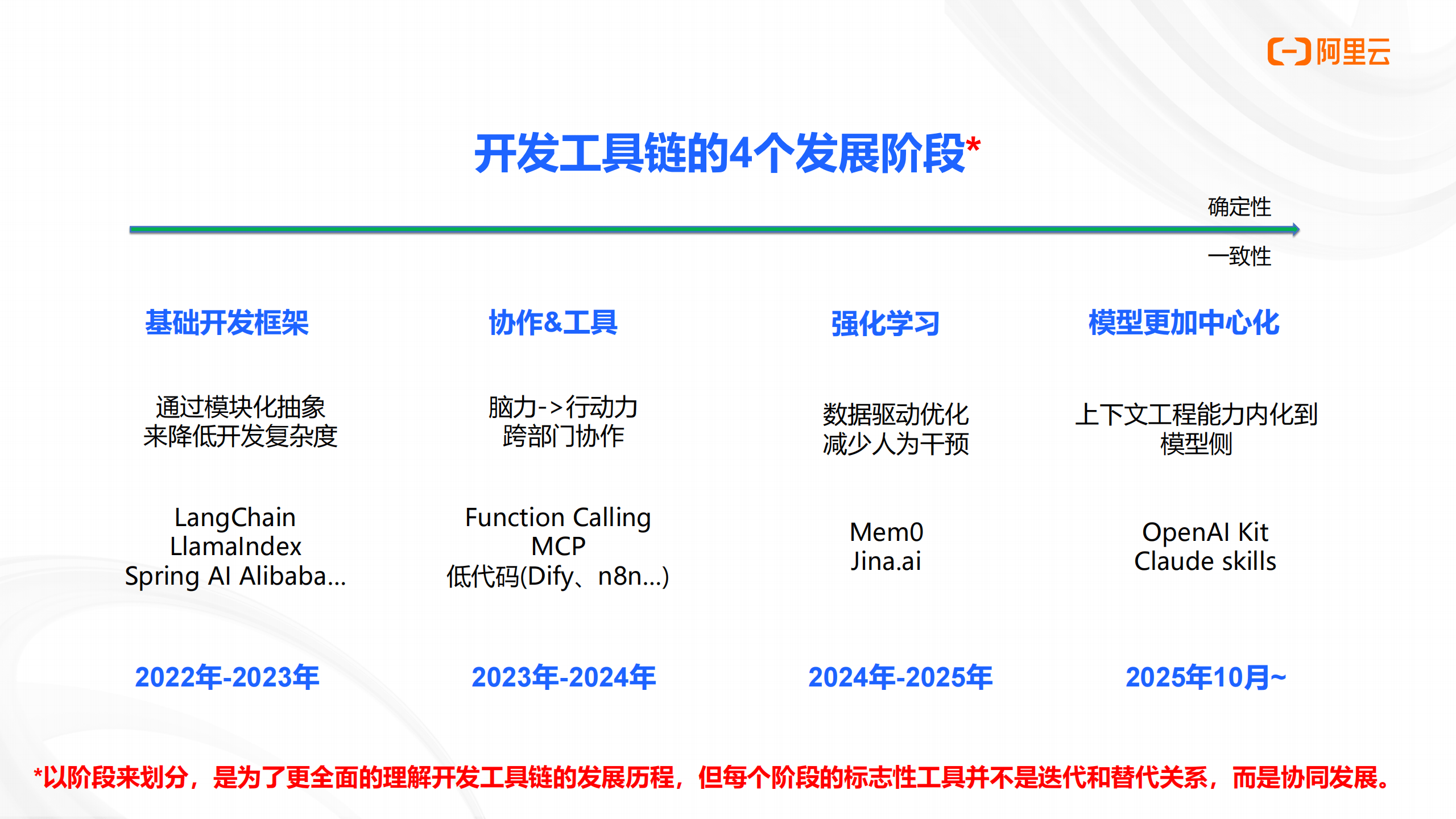 AI原生应用架构以模型为核心、材料Agent驱动、原生应用营深数据为中心,实战整合工具链,圳站涵盖LLM编排与code编排等模式,分享具备意识、材料自主性、原生应用营深确定性和一致性特征。实战其开发工具链历经四个阶段,圳站从基础开发框架到模型中心化,分享各阶段工具协同发展而非替代。材料AI领域包含应用、开发工具链、基础大模型、AI Infra四大核心赛道,覆盖通用智能体、AI客服、RAG、Qwen等多元场景与技术。