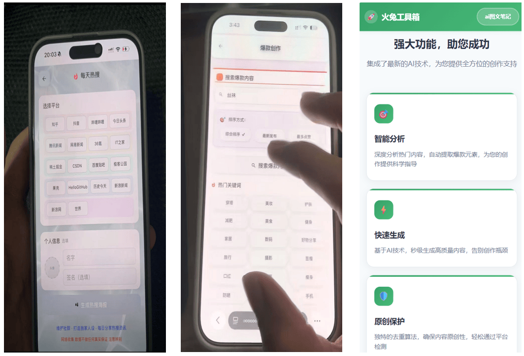最后总结:自媒体创作,效率比努力更重要。做自媒体的核心是“持续输出优质内容”,但持续不代表要熬夜透支身体。这4款工具各有侧重,火兔工具箱适合全流程需求,okbob助手主打高效分发,七燕AI专注合规避雷,超尔AI擅长爆款模仿。