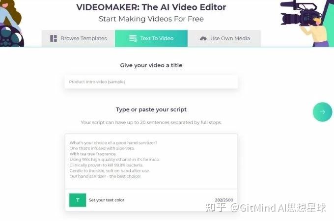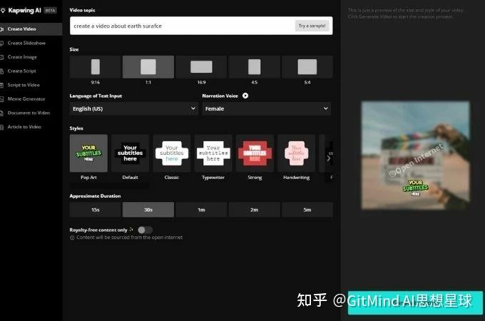 对于视频剪辑刚入门的新手,Kapwing是一个很理想的工具。只需要输入视频脚本,Kapwing就能在几秒钟内轻松制作出完整的视频。除此之外,还可以选择视频的大小、语言、旁白声音和视频的时长。你还可以通过更换文字样式让视频字幕更美观、更有个性。如果你只有一个主题,不知道怎么写脚本的话,Kapwing也可以直接帮你生成脚本。