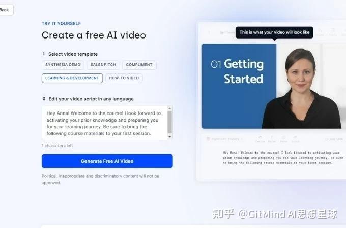 Synthesia也是一个很棒的AI视频生成工具,只需两个简单的步骤就可以使用AI免费生成视频。Synthesia还提供销售、教育等五个行业的视频模板。你需要做的就是输入视频脚本,AI会处理剩下的一切。Synthesia还可以同时生成AI配音和AI数字形象,让你的视频看起来更加专业。