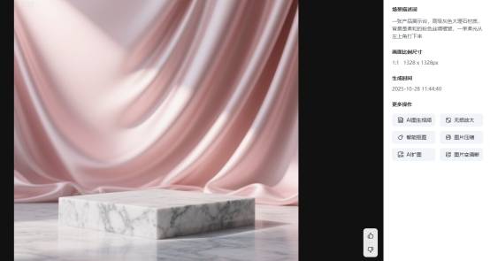 指令:一张产品展示台,高级灰色大理石材质,背景是柔和的粉色丝绸褶皱,一束柔光从左上角打下来